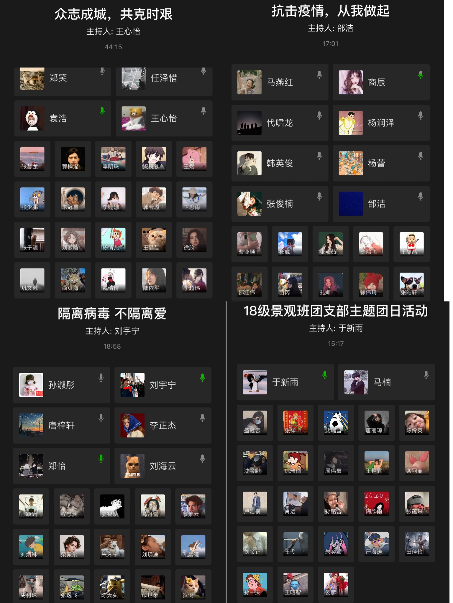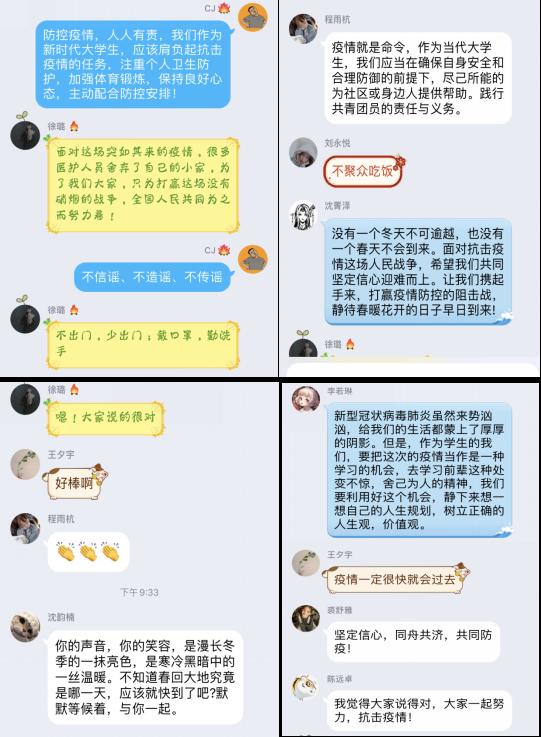 3月9日下午“全国大学生同上一堂疫情防控思政大课”结束后,建筑与景观设计学院团总支组织开展了一次别开生面的线上主题团日活动。各年级团支部通过企业微信APP、QQ班级群等线上平台,结合疫情防控思政大课的内容,围绕“青春抗疫,从我做起”主题,自主选择了“抗击疫情,从我做起”、“隔离病毒,不隔离爱”、“众志成城,共克时艰”等题目,运用语音+文字的方式展开热烈的讨论。本次活动由各班团支部书记主持,全体共青团员积极参加。建筑与景观设计学院党总支副书记娄彦、辅导员陈铁、韩晓旭分别深入到各团支部指导主题团日活动。