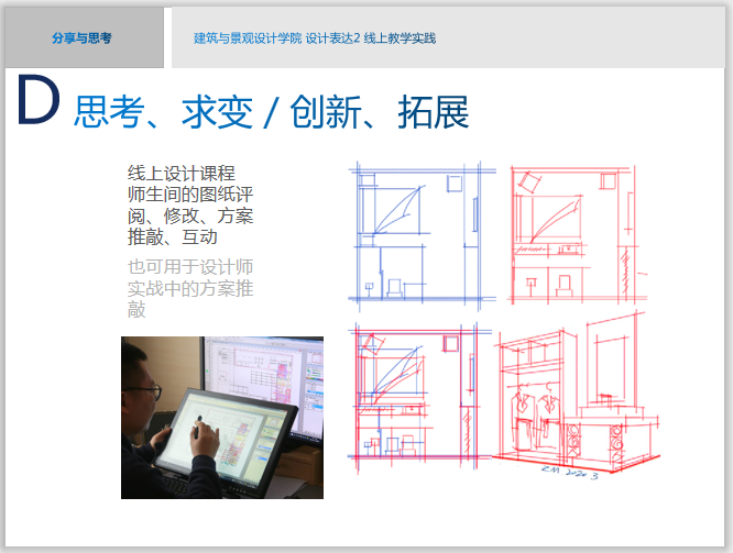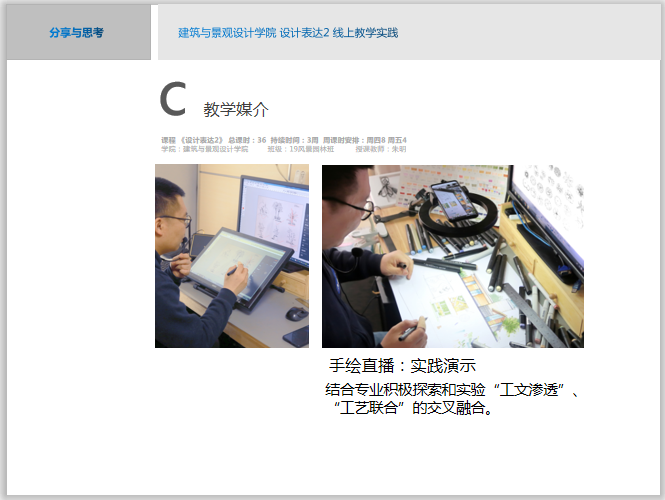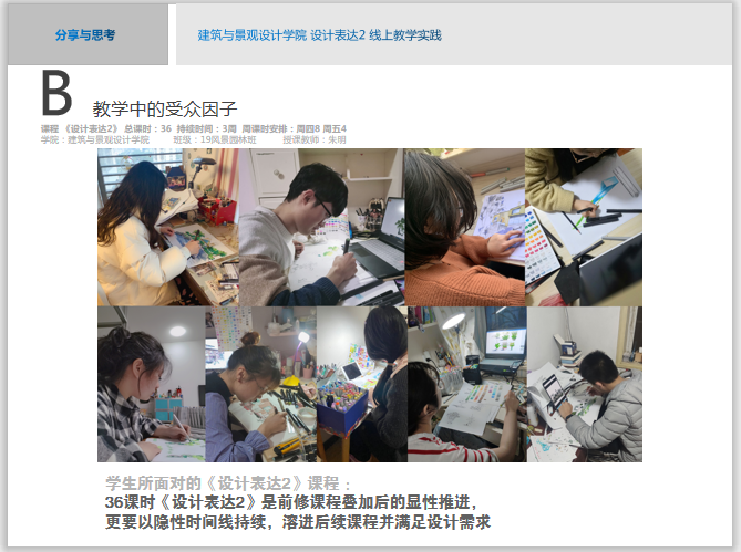 会议由教务处孙磊处长主持,副院长董占军全程参加了此次分享会。首先由教学单位汇报教学情况,然后是教师代表发言。建筑与景观设计学院汇报了前三周授课情况,从面对的问题、解决的方法、教学结合防疫设计三方面进行了总结汇报。朱明老师就《设计表达2》进行了网络教学经验交流与分享。汇报了在“思考、求变、创新、拓展”中做好教学模式创新,探索出适合理科生特点的设计表达,以及为后续专业设计课程打好造型基础的方法。重点分享了基于受众的教学设计及创新在线教学方法。教学经验交流还分享了其他7位教师的典型经验与成果,为共同探讨在线教学经验,创新网络教学方法,切实促进在线教学质量奠定了基础。