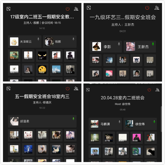 三位辅导员老师首先向各位学生干部疫情期间对学校各项工作的支持与配合表示肯定与感谢。随后向同学们传达了学校《关于2020年“五一”假期放假有关事项的通知》。三位老师对学生安全稳定工作进行详细部署,对于假期内出行的交通安全、食品安全、人身和财产安全予以重点强调;对疫情防控工作进行再叮嘱、再动员,要求同学们遵守各地区疫情防控规定和学校有关疫情防控工作要求,坚持每天按时向学校报备个人健康信息,尽量避免到人群密集地方,尽量减少外出,减少各类聚餐活动,禁止出国;外出时要做好自我保护,戴口罩,勤洗手;要求学生干部要随时了解同学们的健康、思想和心理状况,确保信息渠道畅通,及时与辅导员沟通上报同学们的相关情况。再次强调严禁私自返济、严禁返校。五一假期结束后按照新的作息时间上课,要求同学们严守上课纪律,课后认真完成作业,确保学习效果。毕业班的同学,要主动加强与毕业设计指导教师的联系与沟通,认真做好毕业创作,要积极参加网络招聘会,扩大就业渠道,努力实现就业。