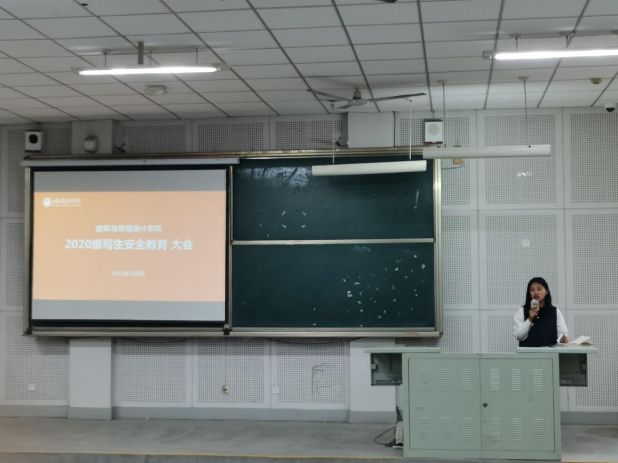 接着,韩晓旭就本次年级大会外出写生进行安全教育。首先,要求大家端正外出写生的态度,切忌浮躁,认真对待,保质保量地完成外出写生的学习任务;其次,强调外出写生期间增强集体观念,全面提高防范意识和自我保护能力,认真听取任课老师的指挥,有问题及时向任课老师反映。同时班干部发挥好带头作用,做好任课老师与学生之间的沟通,严禁离群、晚归、夜不归宿等状况的发生;班委要根据各班的“班委督查”计划,关注落实自己所负责的督查互助的小组成员。第三,提醒同学们做好外出写生的准备,包括写生工具、衣物、等;同时考虑到外出写生期间同学们可能会遇到突发病情、水土不服等,提醒大家备好基础用药;第四,就外出写生期间的安全问题进行重点强调,韩晓旭提醒大家注意人身安全、财务安全、出行安全、饮食安全等,带领同学认真阅读《建筑与景观设计学院学生外出写生、考察安全保障书》;第五,要求同学们外出写生之前整理好宿舍内务,保证宿舍整洁、安全。第六,外出期间做好个人疫情防护,戴口罩,勤洗手,尽量减少不必要的外出和聚集。