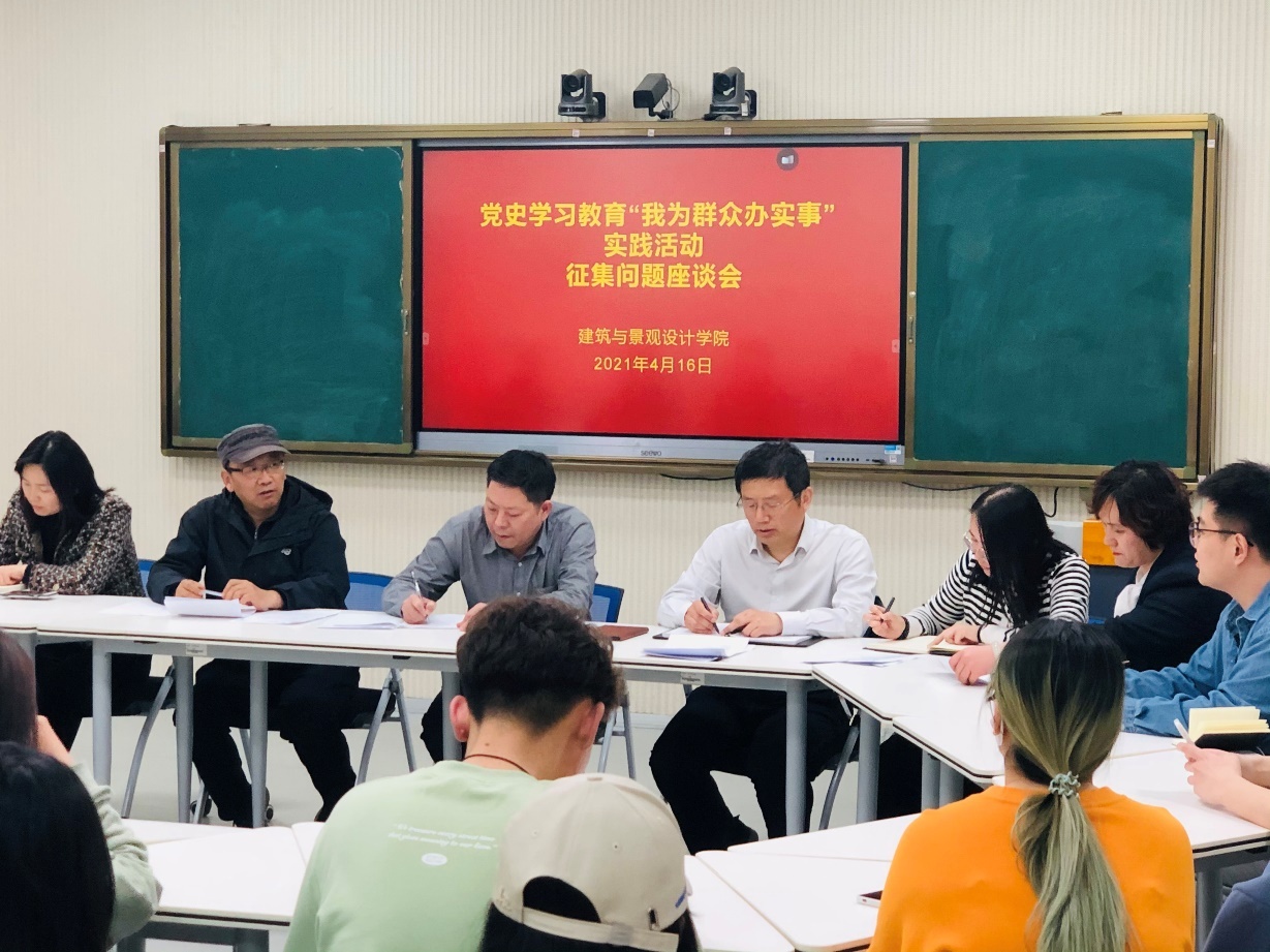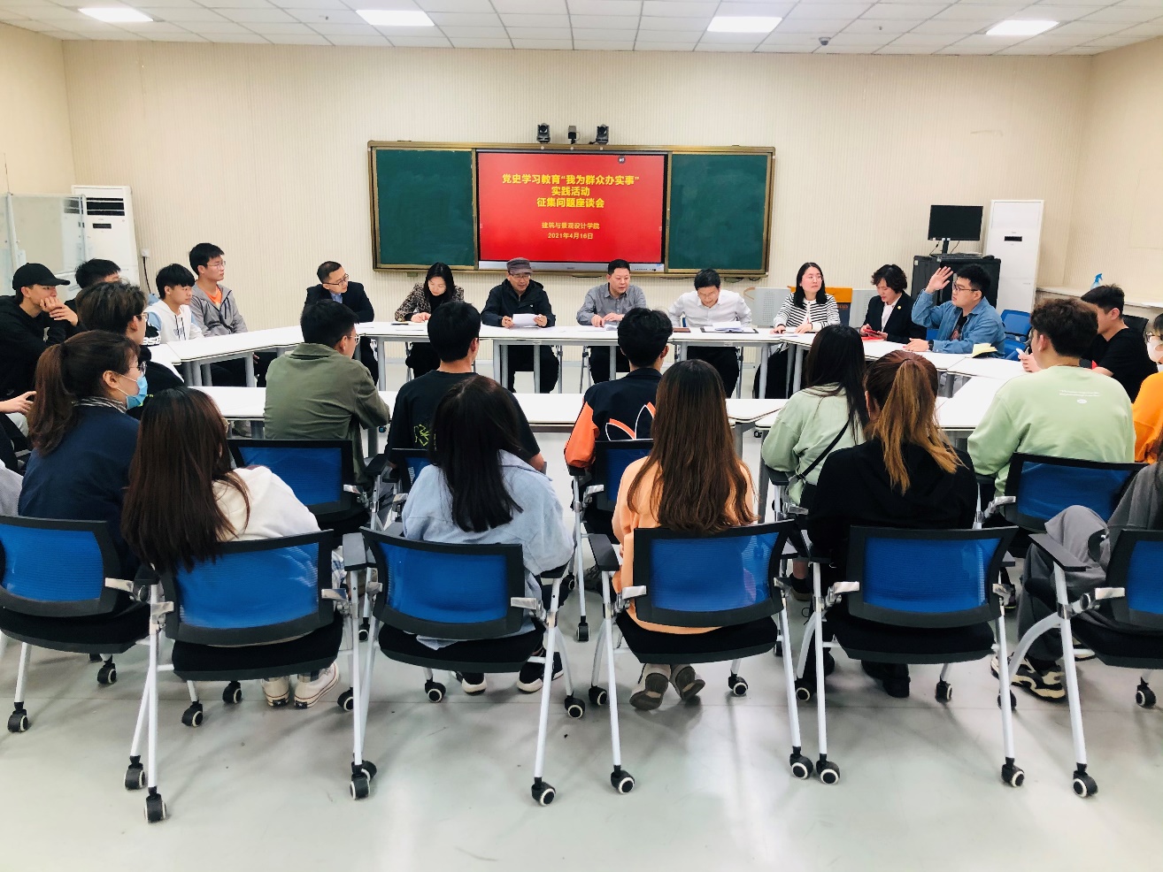 4月16日,建筑与景观设计学院党史学习教育“我为群众办实事”实践活动座谈会,征求同学们的意见建议,党委委员、党委组织部部长许磊、学生处处长张军波、团委副书记孙艳丽、山东明德物业管理集团总公司威尼斯7798cc项目部学生公寓主管徐楠、辅导员褚丁庆、陈铁参加会议,党总支书记张东深主持会议。
