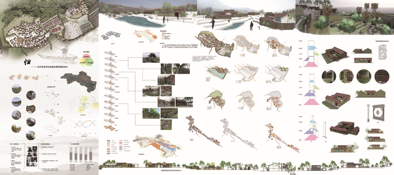 教师在进行乡村建设实践的同时,也指导学生在做相关的研究与实践。近年,乡村振兴与乡村建设有关选题是学生毕业设计比较集中的选题方向。在教师指导下,学生深入乡村进行调研,从乡村生态环境、人居环境、民间习俗、产业基础、公共服务等多方面全方位的调研收集资料,全面了解乡村建设现状问题,在教师指导下,同学们积极拓展思路,思考乡村建设和乡村景观提升的解决之道,开展有针对性的探讨研究。毕业生的同学们发挥自己的观察能力和创新创意能力,乡村建设选题类型丰富多样,涉及景观、旅游、康养度假、乡村建筑、乡村红色旅游等多种题材,经过科学的系统性规划设计,提出了一些具有建设性的解决问题的思路和方法,产生了一批优秀作品。