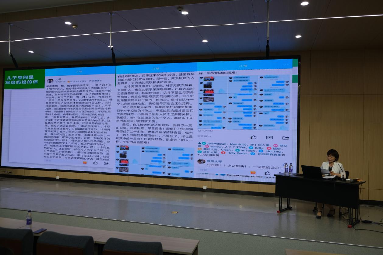 郭芳主任用自己感人的亲身经历为我们分享了抗疫故事与抗疫精神,作为山东省第四批援助湖北医疗队队长,她带领团队勇敢逆行,奔赴疫情重灾区。郭芳主任讲到:进舱前穿脱防护服训练与考核极其严苛,为了达到考核合格,日夜训练;在做好专业护理同时,还积极带领团队搬运物资、完成每天的日常消毒;带领患者跳洗手舞,抚慰患者心灵,传播防疫知识;为了避免交叉感染,每天在方舱外顶着寒风冒着雨雪站着解决一日三餐。期间充满了艰辛困苦,一度逼近了人的承受极限,但整个团队展现了一家人一样的团结友爱,展示了大无畏的牺牲精神,尽管要克服极度劳累,尽管要冒着随时被感染的风险,尽管焦虑来袭,但是大家义无反顾,勇往直前。