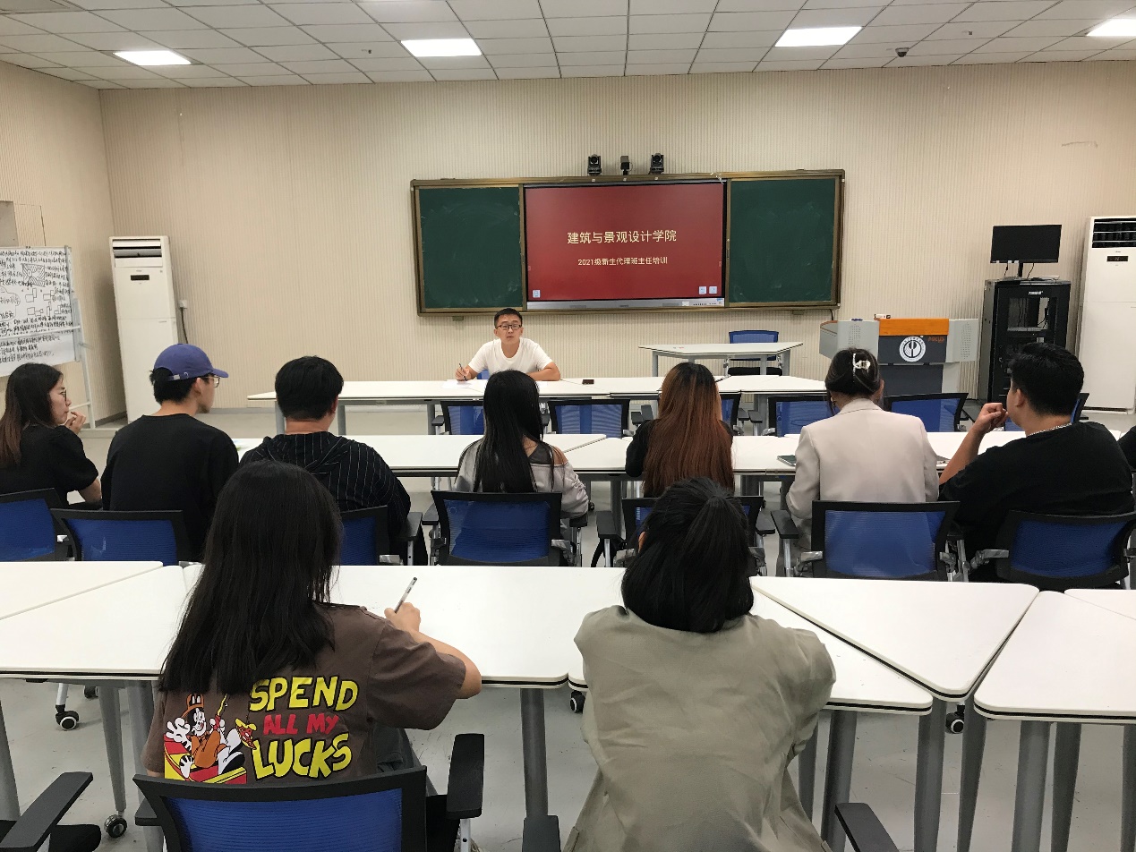 9月8日下午,建筑与景观设计学院在智慧教室开展2021级新生代理班主任培训。新生辅导员陈铁老师和2021级新生代理班主任参加。