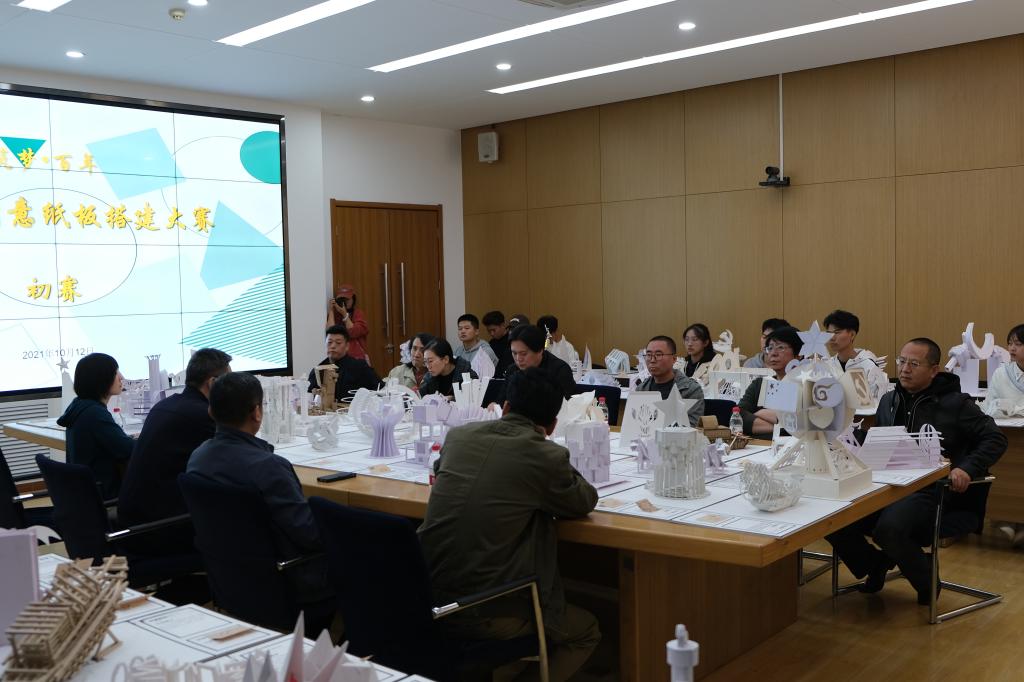 首先,褚丁庆介绍了纸板搭建大赛的相关情况。为了进一步推进党史学习教育走深走实,表达对伟大的中国共产党百年华诞的深情祝福,本届创意纸板搭建大赛的主题确定为“筑梦·百年”。本次大赛初赛作品采用了搭建实体模型和图文介绍相结合的方式收集作品,征集涵盖了9个学院共103份方案。团委副书记王军强就大赛评审要求进行了说明,作品要紧扣主题,体现出独特的艺术构思同时体现美感。他希望评委们能够兼顾艺术性、创新性、可行性和严谨性等多个维度进行评选,确保入选作品质量。