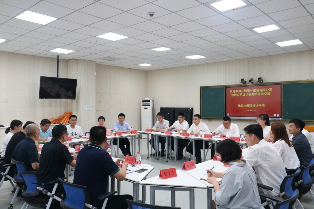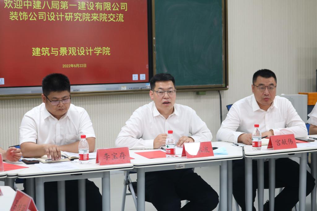 6月22日下午,中建八局第一建设有限公司装饰公司设计研究院党总支书记于永波、设计总监李宝存、设计管理所所长明宪英及多位所长、设计师前来我院走访、交流。党委组织部部长许磊、建筑与景观设计学院院长李文华、副院长王健、党总支书记姬升果、副书记姜华及各教研室主任、教师出席座谈会。
