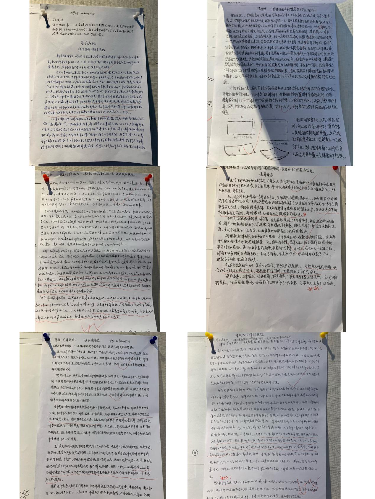 第一次接触这样的作业,学生感觉难度颇高,这需要师生共同努力。徐民彦在与学生一对一进行结构方案探讨的同时,发现问题,汇总小结,不时穿插为全体学生绘图讲解;每位学生与老师多次沟通,反复琢磨、不断调整,从刚开始面对方案无从下手到逐渐思路清晰,最后作业也完成得有模有样。三周连续的教与学,虽然过程辛苦,但学生收获满满,并用文字记录了自己的领悟和体会。