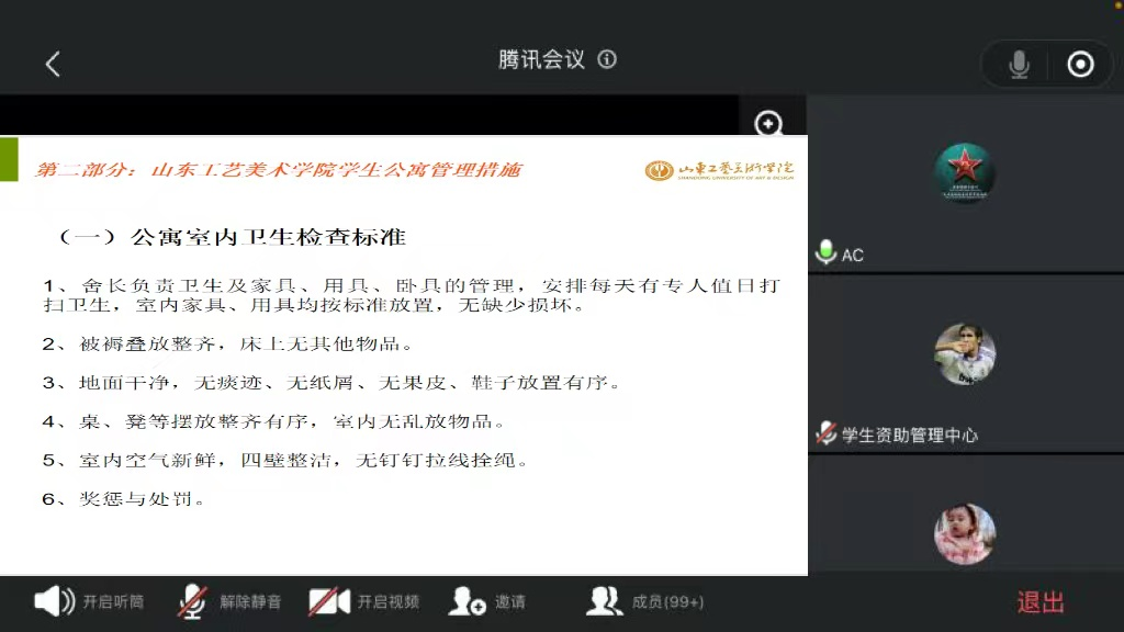 孙毅向同学们说明公寓考勤注意事项,必须遵守公寓的作息规则,坚决杜绝晚归、夜不归宿的现象出现,进出宿舍必须打卡。随后,孙毅重点强调了公寓纪律。一是严禁在宿舍使用火锅、酒精灯、“三无”产品等违章电器,不使用不合格的插排,不私拉电线,务必做到人走灯灭、断电、落锁,切实提高安全意识。二是说明了宿舍饲养宠物的危害,提醒大家禁止在宿舍养宠物;三是强调严禁在公寓内抽烟、打闹、涂鸦乱画等。孙毅老师在讲解中进一步强调公寓内出现违纪行为会有相应的处分措施,希望大家能够切实提高安全意识,严格遵守宿舍纪律。接着,孙毅老师给大家说明了宿舍内卫生标准,包括家具摆放、被褥整洁、地面干净、板凳摆放有序等,希望大家营造一个舒适干净的生活环境。最后,孙毅老师向大家表示,学生处公寓科一直本着为每一个学生提供服务的态度开展工作,大家有任何困难问题随时来公寓科反映,公寓科将会及时解决。
