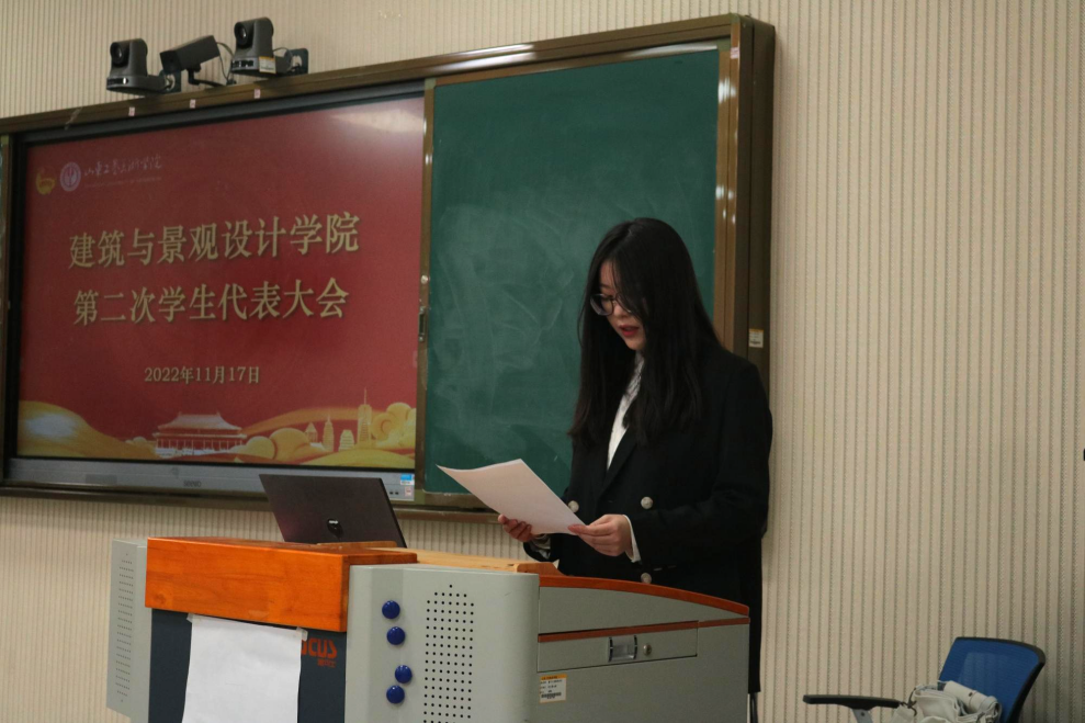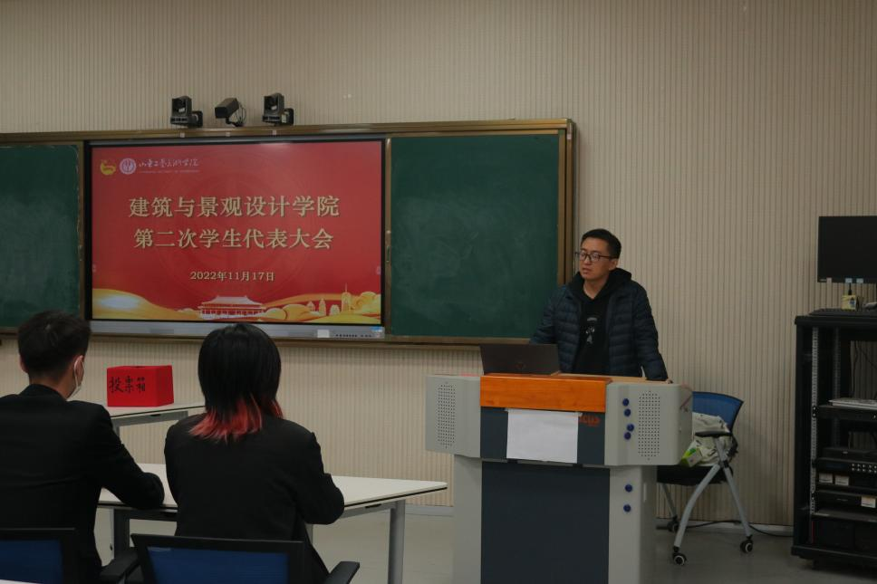 11月17号,建筑与景观设计学院第二次学生代表大会在智慧教室召开。来自各部门以及学院学生组织推选的共计43名学生代表参与本次会议,团总支书记陈铁作为此次会议嘉宾出席此次会议。