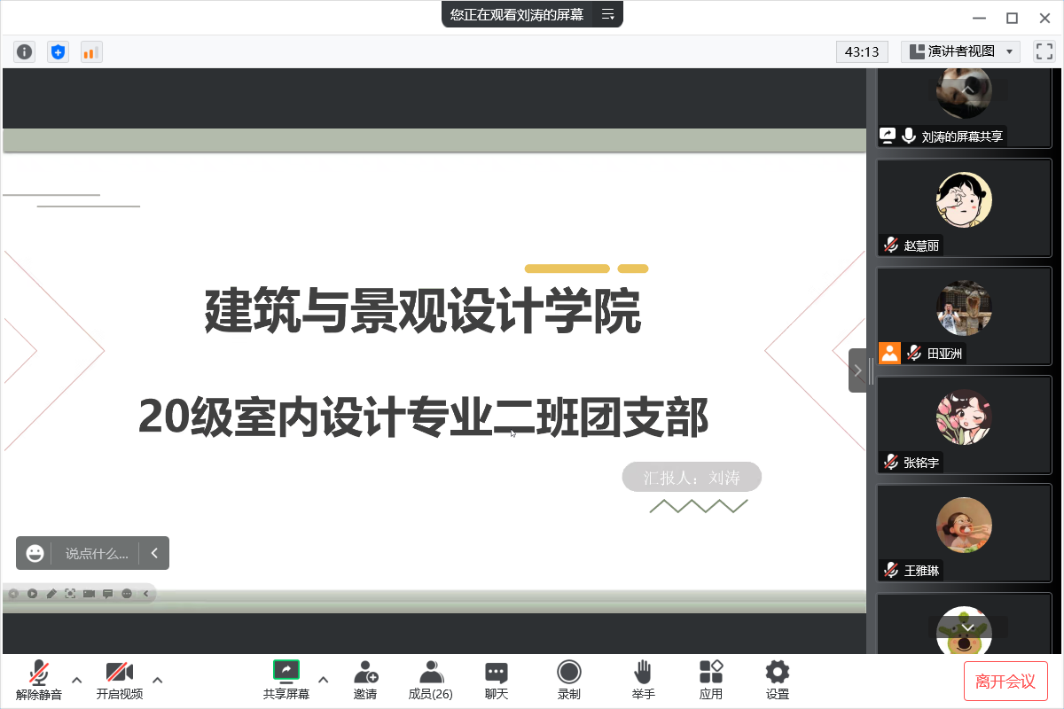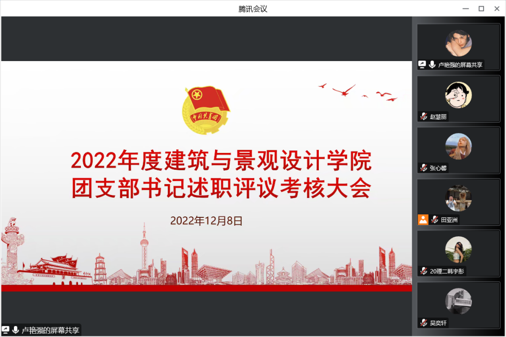 为持续推动基层团组织规范化建设,检验团支部工作成效,按照团委基层团支部述职工作安排,建筑与景观设计学院团总支于12月8日开展线上团支书述职大会,本次会议由团总支书记陈铁主持,各年级辅导员、团总支委员及各班团支部书记参加。