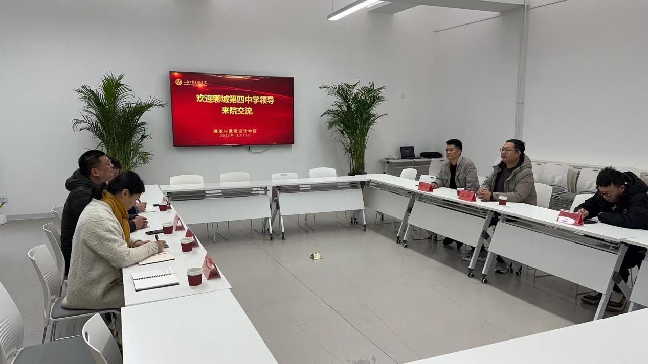 12月11日,建筑与景观设计学院邀请聊城第四中学校长王涛、艺教科主任于万金等一行来院交流访问,开展访企拓岗促就业专项行动,双方围绕岗位需求、特色教育与社会实践、党建引领合作发展等方面展开座谈。学院党总支书记姬升果、副院长胡英盛、副书记姜华、办公室主任齐晓星参加交流。