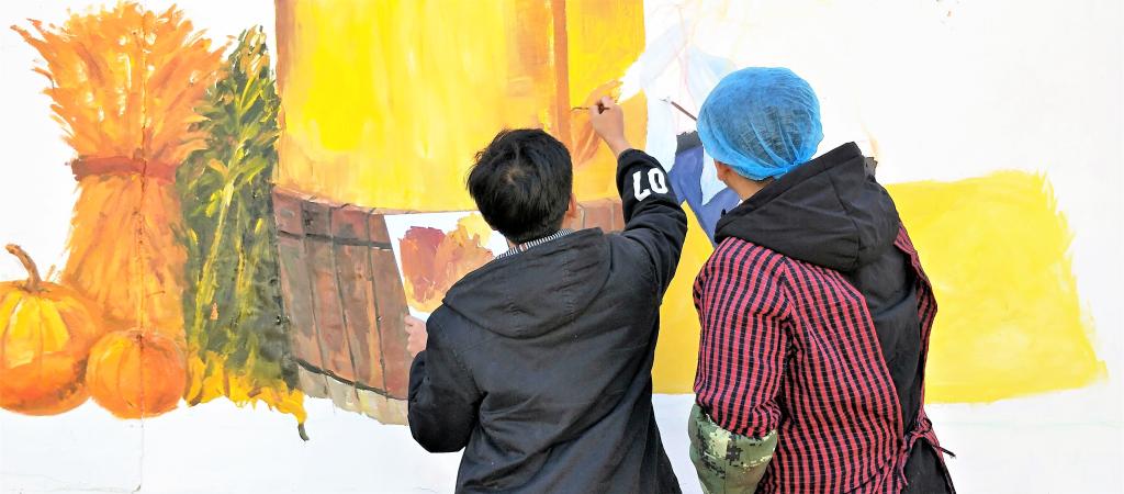 本次墙绘活动以农耕文化为主题,同学们拿起手中的画笔,在乡村墙体上进行创作。一幅幅绘有种田、收割、晾晒等农耕文化和体现乡村文明、勤劳致富、社会主义核心价值观以及董家村特色文化等多项内容的墙绘,极富历史感和宣传教育效果。同学们互帮互助,齐心协力,选图、起形、上色、修图,每一个步骤师生们都画得精益求精,力求完美。