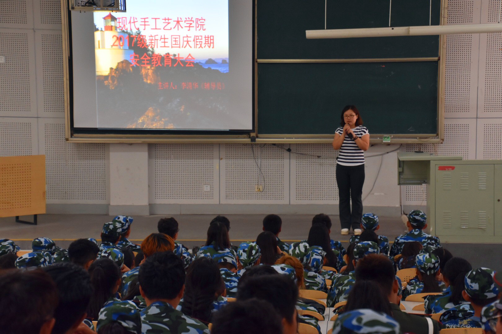 2017年9月29日上午11点,现代手工艺术学院于威尼斯7798cc长清校区综合办公楼六合堂召开2017级国庆中秋假期安全教育大会。会议由我院新生辅导员李清华主持 17级全体新生及代理班主任参加了此次会议。