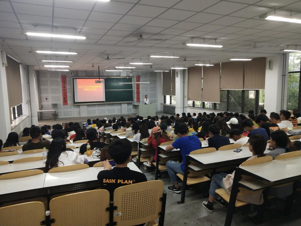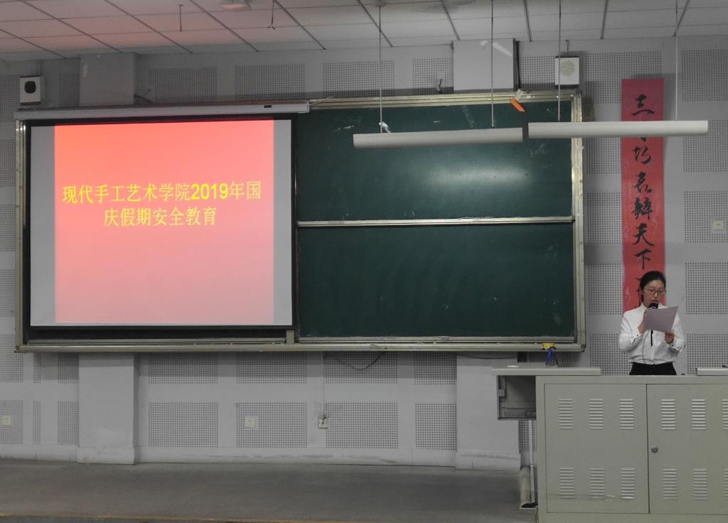 9月29日下午,现代手工艺术学院在办公楼七合堂召开了2019级新生国庆假期安全教育大会,会议由2019级辅导员刘化真主持,现代手工艺术学院2019级全体同学及代理班主任参加会议。