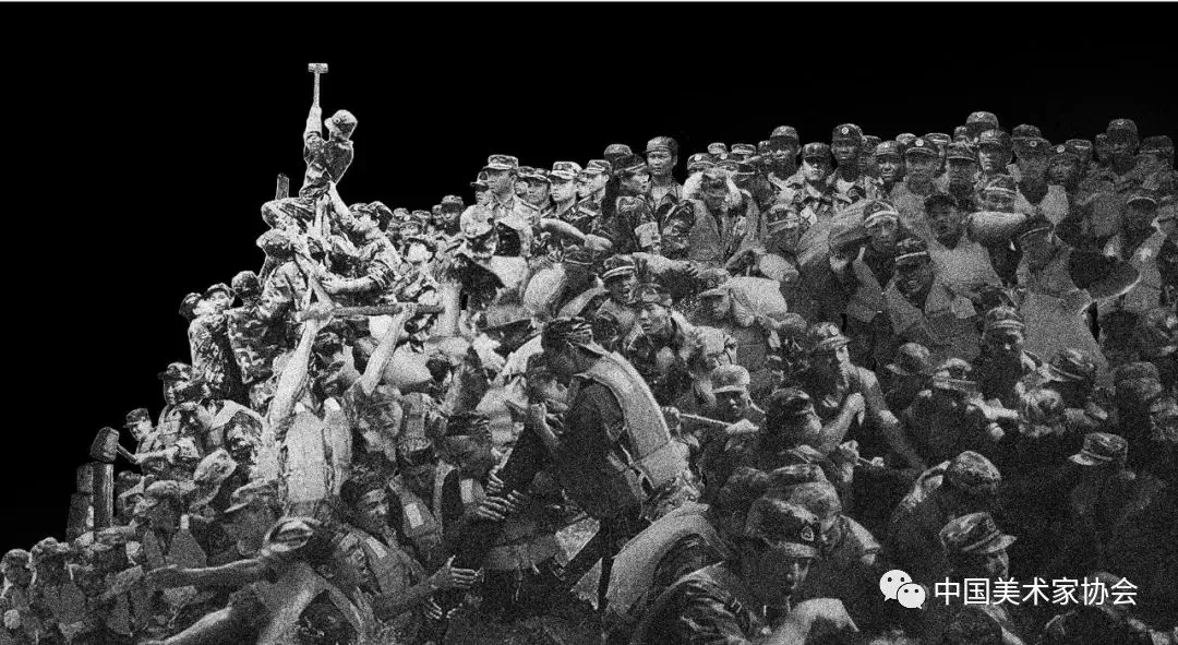 设计理念:作品是在不锈钢板上利用手工雕刻的技法进行创作的。画面由近200多位抗洪战士在抗洪抢险第一线的战斗场面组成了山脉的形状,象征着抗洪战士用自己的身体构成了犹如大山一般的铜墙铁壁,与洪水抗争力量如山。画面左上角的军人用尽全力举起的大锤如灯塔一般照亮了周围,表达了抗洪精神鼓舞着所有人的创作理念。