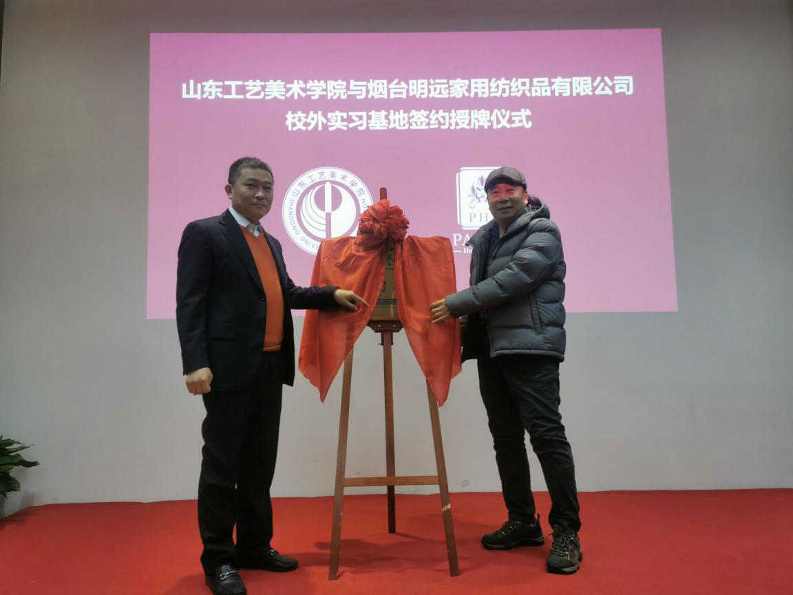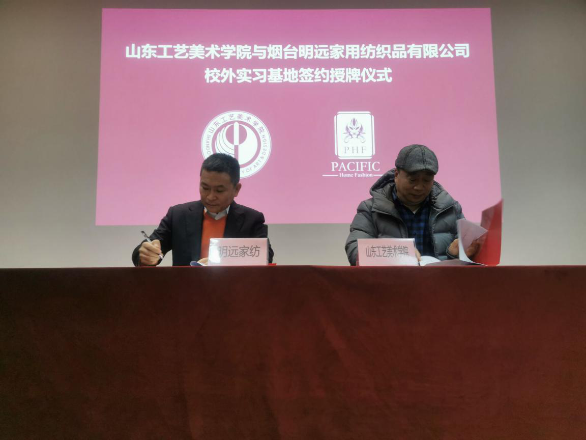 最后,现代手工艺术学院院长赵进与烟台明远家用纺织品有限公司常务副总陈义亮为教学实习基地签约揭牌。