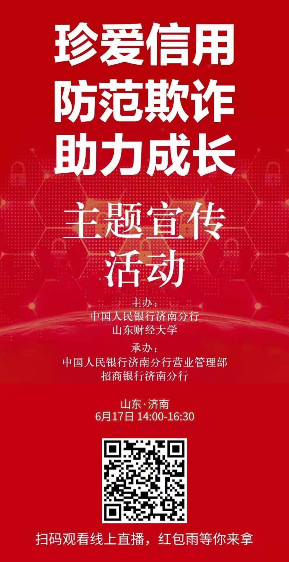 为提高大学生安全防范意识,做好大学生个人征信教育,切实保护自身权益,杜绝校园贷、金融诈骗等情况发生,6月17日,现代手工艺术学院组织全体同学线上观看由中国人民银行济南分行与山东财经大学联合主办的“珍爱信用、防范欺诈、助力成长”主题教育活动。