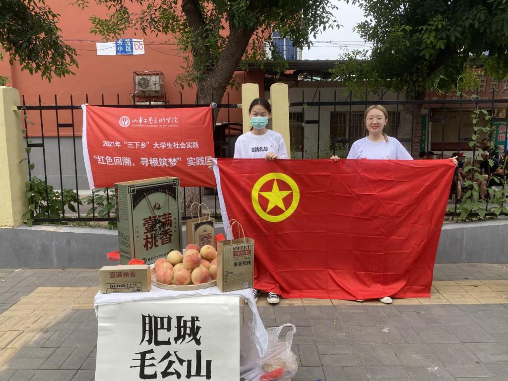 天上蟠桃,人间肥桃。实践团队成员们将采摘的肥桃放入自己设计并制作好的包装设计袋中进行售卖,此次的肥桃售卖不仅仅为了推广肥桃,更是为了宣传肥城当地红色文化。队员们在山东省东营市以及山西省晋城市的集市上进行线下售卖,有了包装的夹持让摊位更加别具一格,来往的路人都被其所吸引,纷纷向前询问。具有独特的包装和特色的肥桃打动了广大消费者,激发了消费者的购买热情,也让山东泰安肥城文化在各地得到了传播。