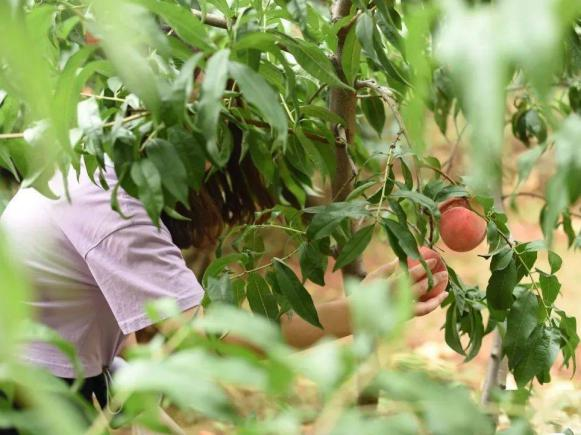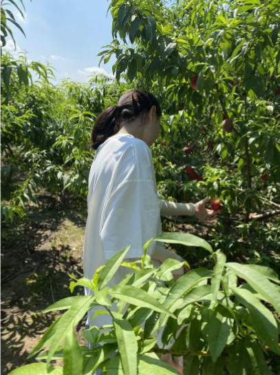 桃园在偏僻的平地中显得栩栩如生,队员们走进万亩桃林,受到了桃园主人的热情接待,在与桃园主人的交谈中队员们大致知悉了桃园的实际情况,了解了一天内在桃园需要做的工作。在分配完工作后,队员们在桃园主人的带领下深入桃园,开始了实地采摘工作。