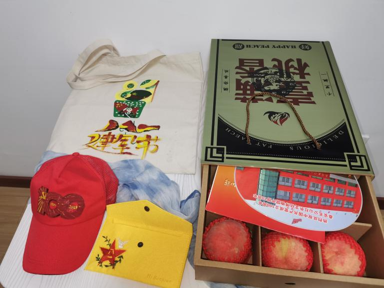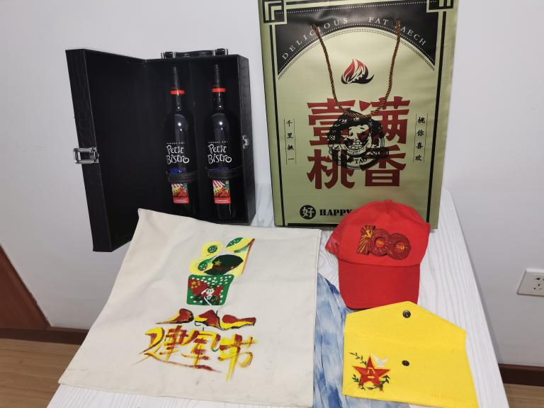 实践团队员们为老红军准备了包装设计好的肥桃礼盒,并利用专业特长,手工制作了带有“八一”标志的刺绣布袋、带有建军节节日特色的帆布包、建党100周年的红色帽子以及老党员赞助的红酒等进行慰问。