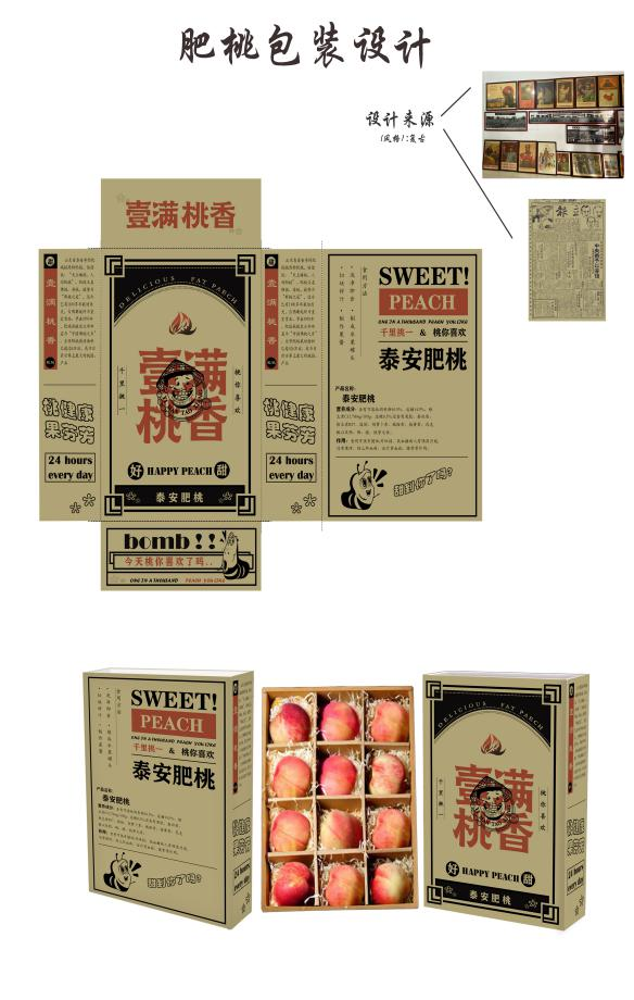 在市场经济飞速发展的今天,产品越来越需要合适的包装来体现本身的特点、品质与优势,包装不仅仅是产品的脸面,更是一种刺激消费的工具。设计源于生活,包装设计更是为消费者服务,实践团队成员将亲自摘下的肥桃进行包装设计,挑选包装实体进行测量,再将产品内容具像化,通过图标、图案、文字等形式将产品的品质展露出来,同时用代表性图案、文字进行再设计,运用到文创产品中,本着审美性、传承性以及实用性的原则,优化文化创意内容及文创产品设计,美化了产品形象。