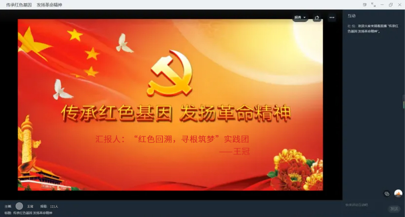 7月20日,“红色回溯,寻根筑梦”实践团部分成员通过钉钉直播的方式,针对本次社会实践面向公众进行宣讲,介绍陆房突围精神战役历史和抗美援朝的相关革命历程,同时向公众推广泰安市博物馆相关的历史文化和抗战历史文化陈列。