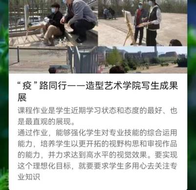 经过一段时间教师和学生的共同努力,公共艺术专业线上课程逐步步入正轨,教学秩序井然,学生组织有序,平台运转良好,师生交流通畅。从目前学生提交的作业情况来看,作业整体进度良好,质量水平保持了较好的层次。