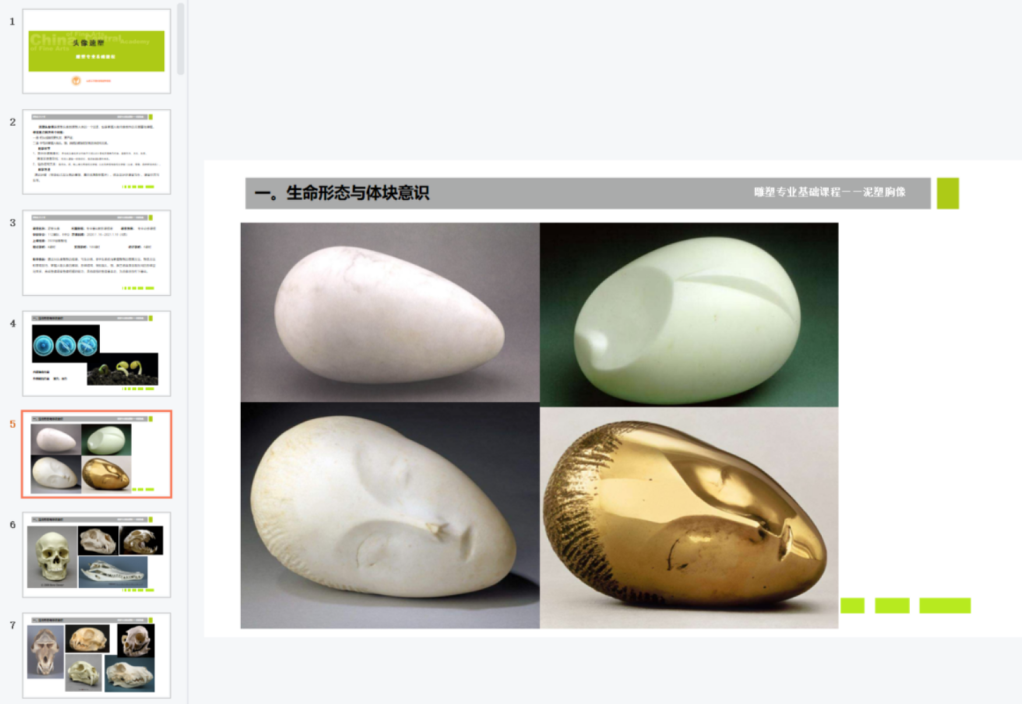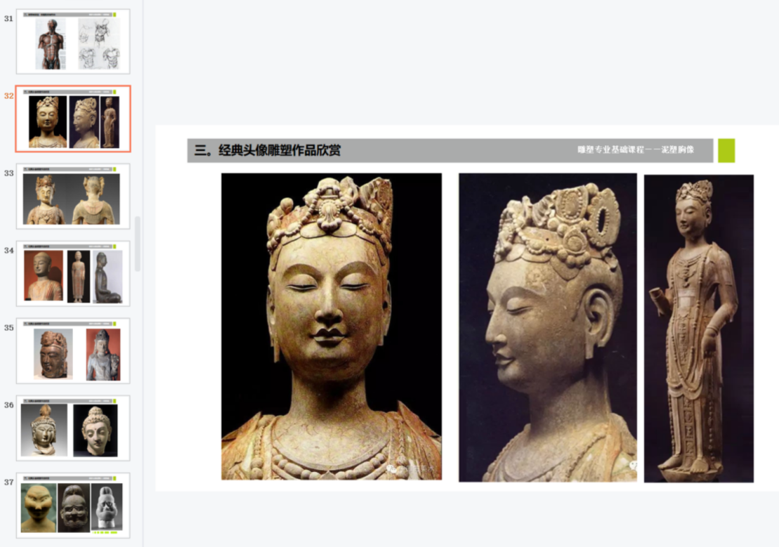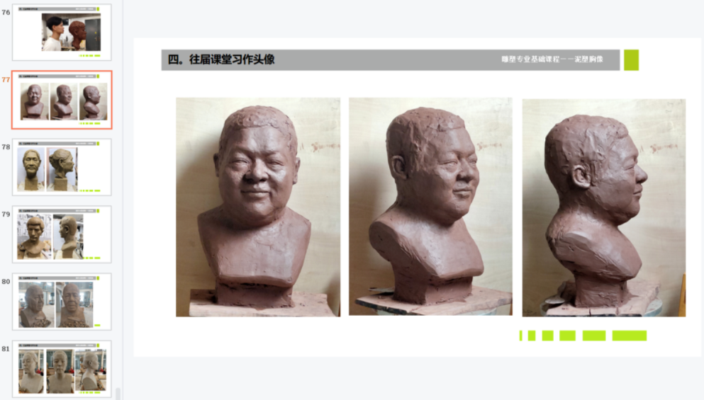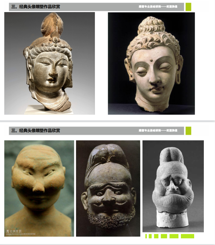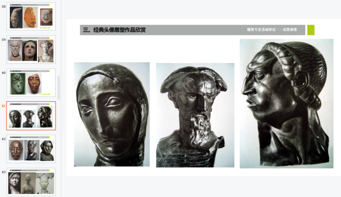 在理论部分课程内容准备方面,除了关于常见的西方学院雕塑分析之外,重点加强了两个部分比重:一个是速塑头像雕塑的特征塑造与精气神把握,另一个是加大传统雕塑的知识量,强调传统造型的解读。这也是本次课程改革之后的变化关键,旨在通过中西结合的学习过程,强调中国传统造型的学习与深入理解,细致讲解,使学生们掌握关键知识点,对于接下来的雕塑学习及创作会大有帮助。