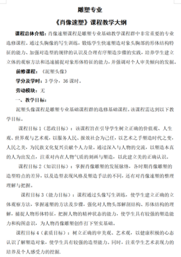 肖像速塑课程是雕塑专业基础教学课程群中非常重要的专业选修课程。是大一雕塑专业第一学年重要的专业动手课程。课程3学分,36课时,大致三周共6个全天。通过头胸像的写生训练,锻炼学生快速塑造对象头胸部的形体结构特征的能力、加强对造型的规律的认识及合理有序塑造步骤的实践,培养学生建立立体的观察方法和迅速捕捉对象形体特征的能力,并强调对个人审美倾向的发掘。