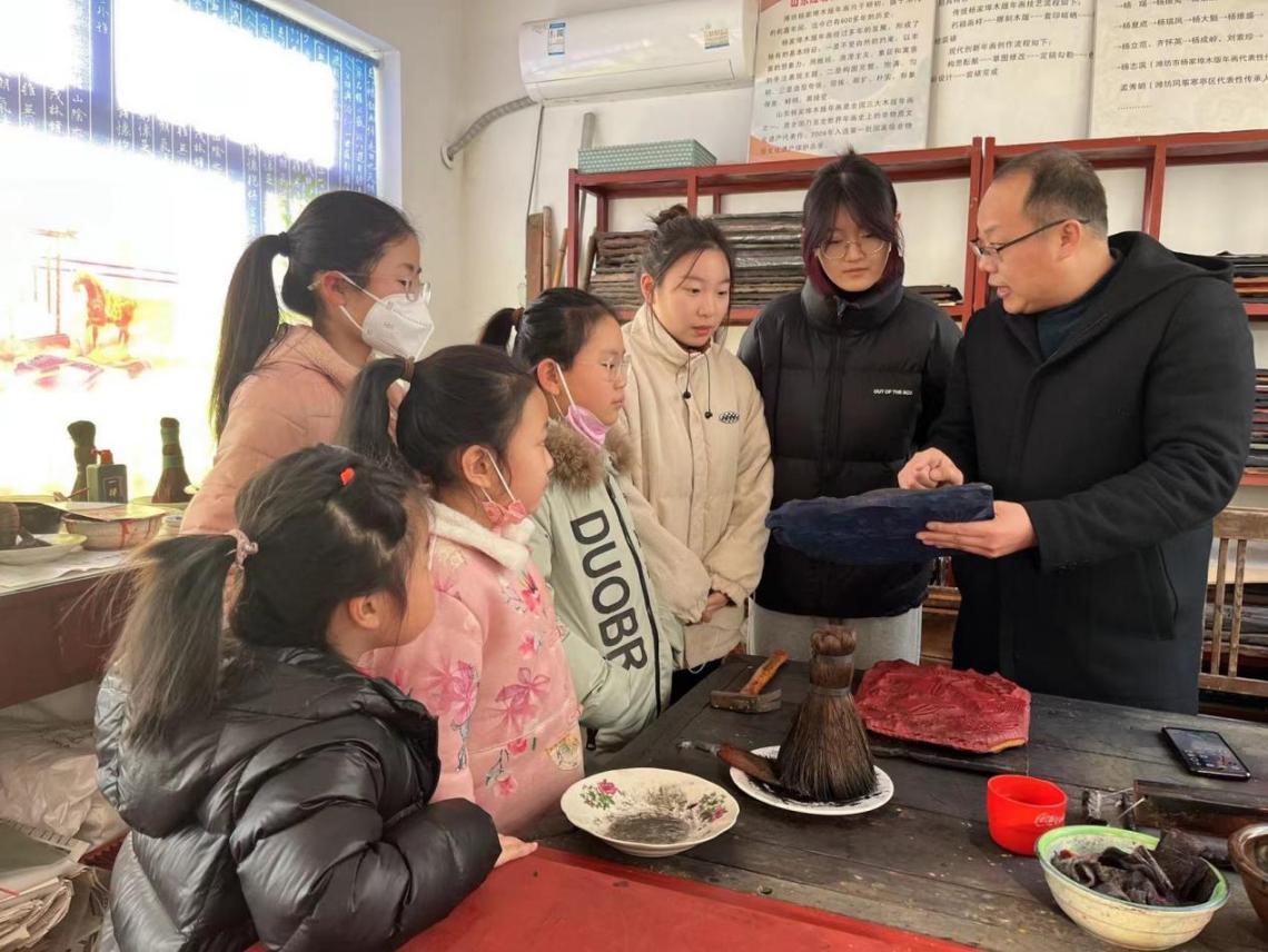 (图为实践团队走进杨家埠木版年画制作课堂学习木版年画制作技法)