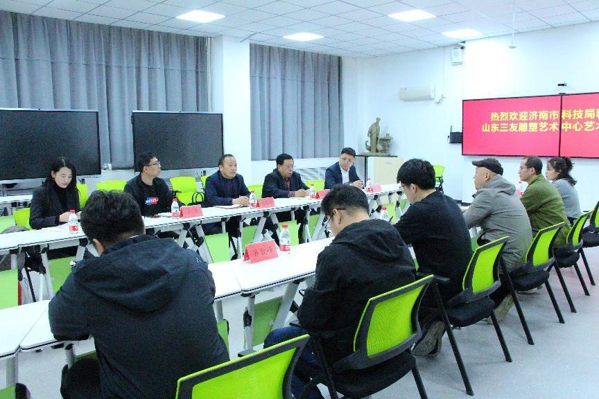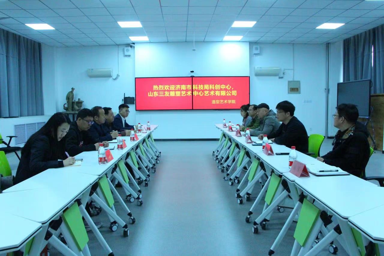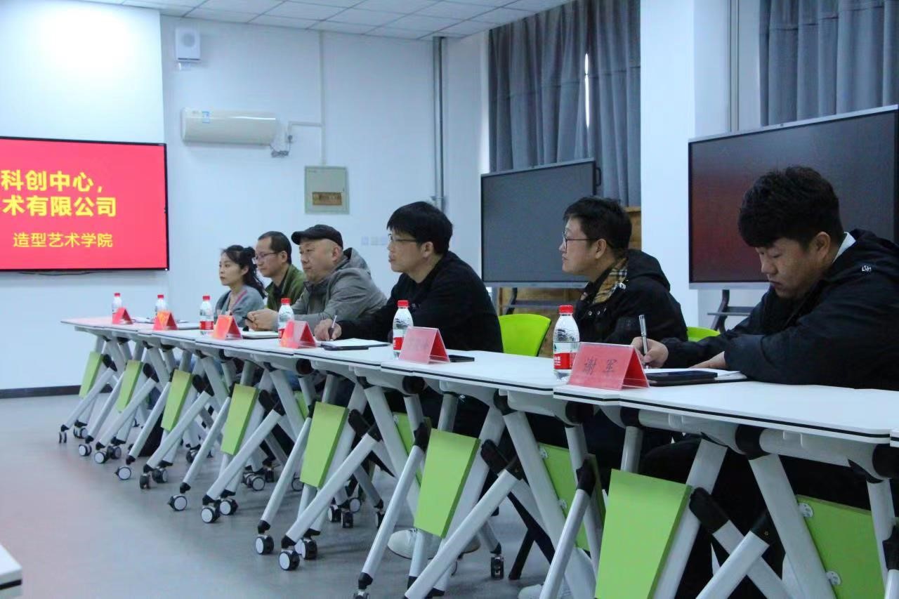会上,刘宁院长向企业介绍了造型艺术学院基本情况、专业设置、师资队伍、人才培养等发展状况,就校企合作内容、横向课题申报、专业课程实践、校企共建团队等内容展开交谈。济南市科技局科技创新促进中心处长田延彬代表单位和企业发言,三友雕塑公司与造型艺术学院合作时间已经两年,校企合作更需要搭建“产学研”融合平台,为深化校地合作模式做出的新探索,不断规范合作模式,实现校地共赢。公共艺术教研室主任杨勇智就专业方面展开交流,企业需要具备具象雕塑制作和设计能力,造型艺术学院学生拥有丰富的想象力和创新能力,能够为企业注入创新活力。壁画教研室主任齐敬峰提出企业和学院应该深入探讨具体的合作点,可以从毕业生毕业作品入手,让因为作品材料和技术限制难以实现制作的毕业作品在企业得到制作落实,让合作做到实处。济阳区科技局局长孙光军表示,科技局对校企合作有很多政策上的支持,当下是校企合作项目申报的好机会,重大创新项目需要企业跟高校合作完成。山东三友雕塑艺术有限公司总经理杜帅表示公司会将现有的资源与学校需求相结合,实现毕业创作作品落地产出,专业老师与公司研究人员共同组建研究团队,带动横向课题研究。
