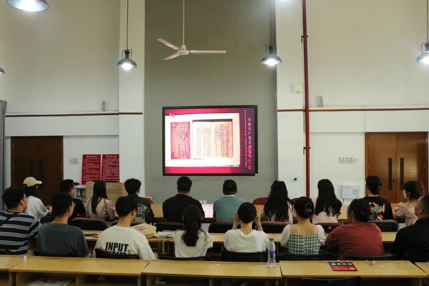 为学习贯彻习近平新时代中国特色社会主义思想主题教育,落实“党章集中学习月”活动,加深全体党员对党章内容的理解和认识,提高党员的信念与爱国热情,5月25日,造型艺术学院学生党支部书记许威治、辅导员朱员、谢军组织全体党员于四楼多媒体观看学习《百年党章》、《我和我的祖国》等系列爱党爱国影片视频。