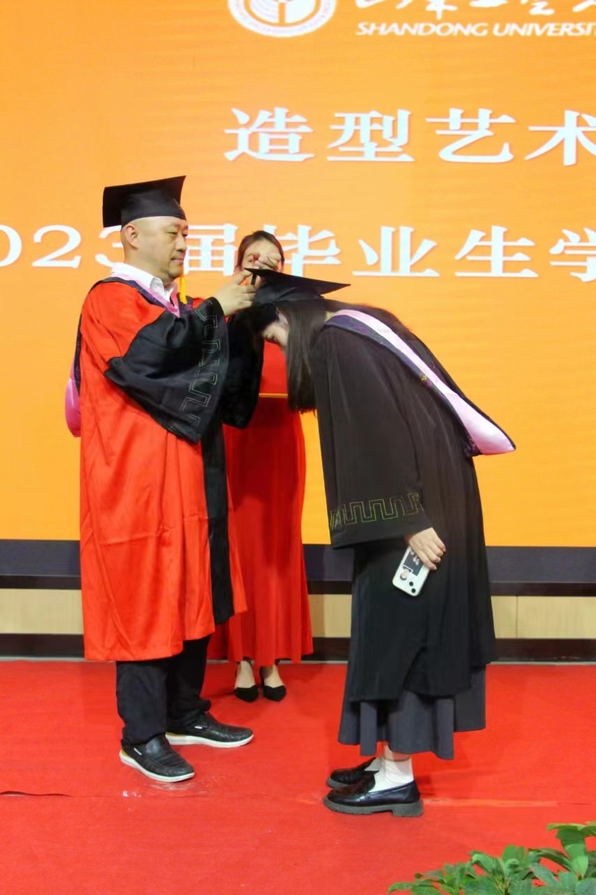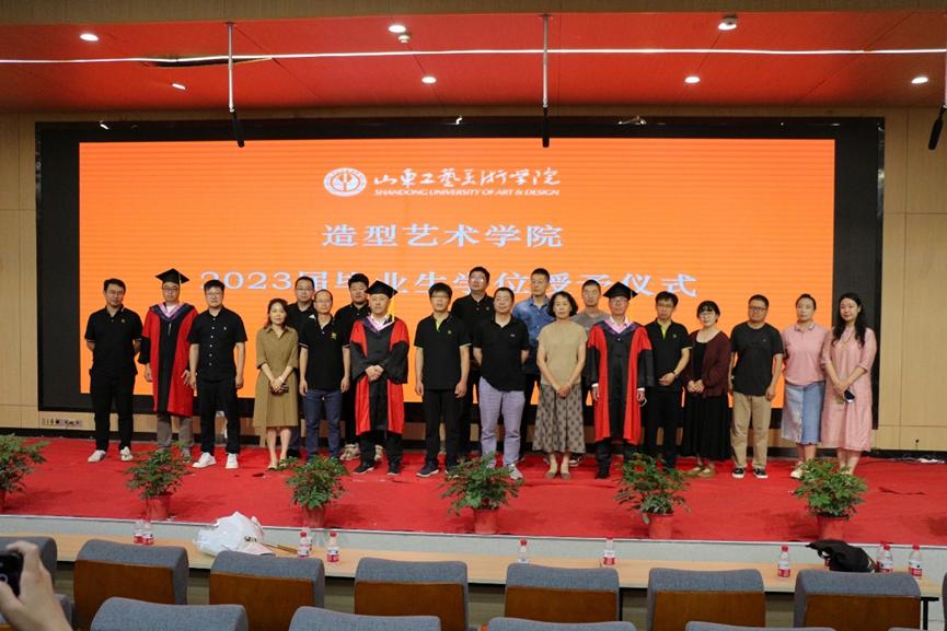 最后,在激昂的校歌声中,造型艺术学院学术委员会刘宁、商长虹、邵仲武、史广信四位教授为所有顺利毕业的2023届本科生拨流苏,授予并颁发学位证书,并合影留念。