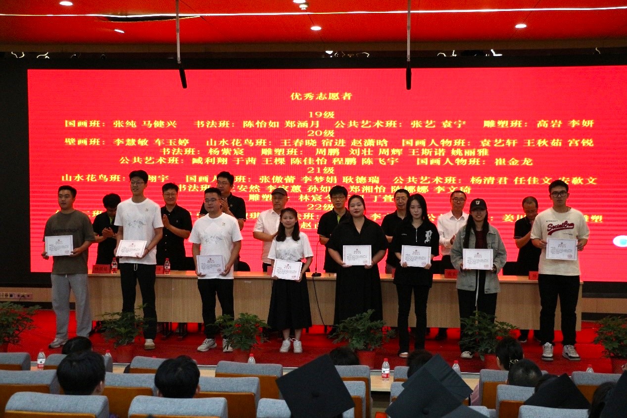 造型艺术学院为获表彰个人颁发荣誉证书。学院领导为造型艺术学院团总支委员和学生会主席团颁发受聘证书,为在校园疫情防控中积极工作的54名同学颁发“优秀志愿者”证书,为本届毕业生中20位优秀学子颁发优秀毕业生证书,为29位学子毕业创作获评“优秀毕业设计作品”颁发优秀作品证书。