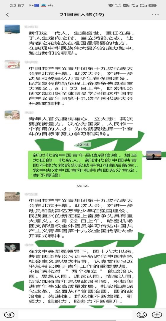 活动伊始,各团支部书记组织同学们集体观看中国共产主义青年团第十九次全国代表大会重要讲话,各团支部书记讲述此次活动对于青年团员的重要意义,并表明当代青年应在担当时代使命中彰显青春的使命,在推动时代进步中实现自身的进步,激励同学们在奋斗中实现人生价值。活动中同学们认真观看、细细品味讲话对于当代青年提出的要求和展望,品读新时代共青团的历史责任,感受共青团的伟大奋斗精神。会后,在团支部书记的发动下,同学们踊跃发言,交流探讨自己的心得与感悟,分享自己与共青团的小故事,讲述自己对于奋斗的理解,品读大会的重要内容和精神。
