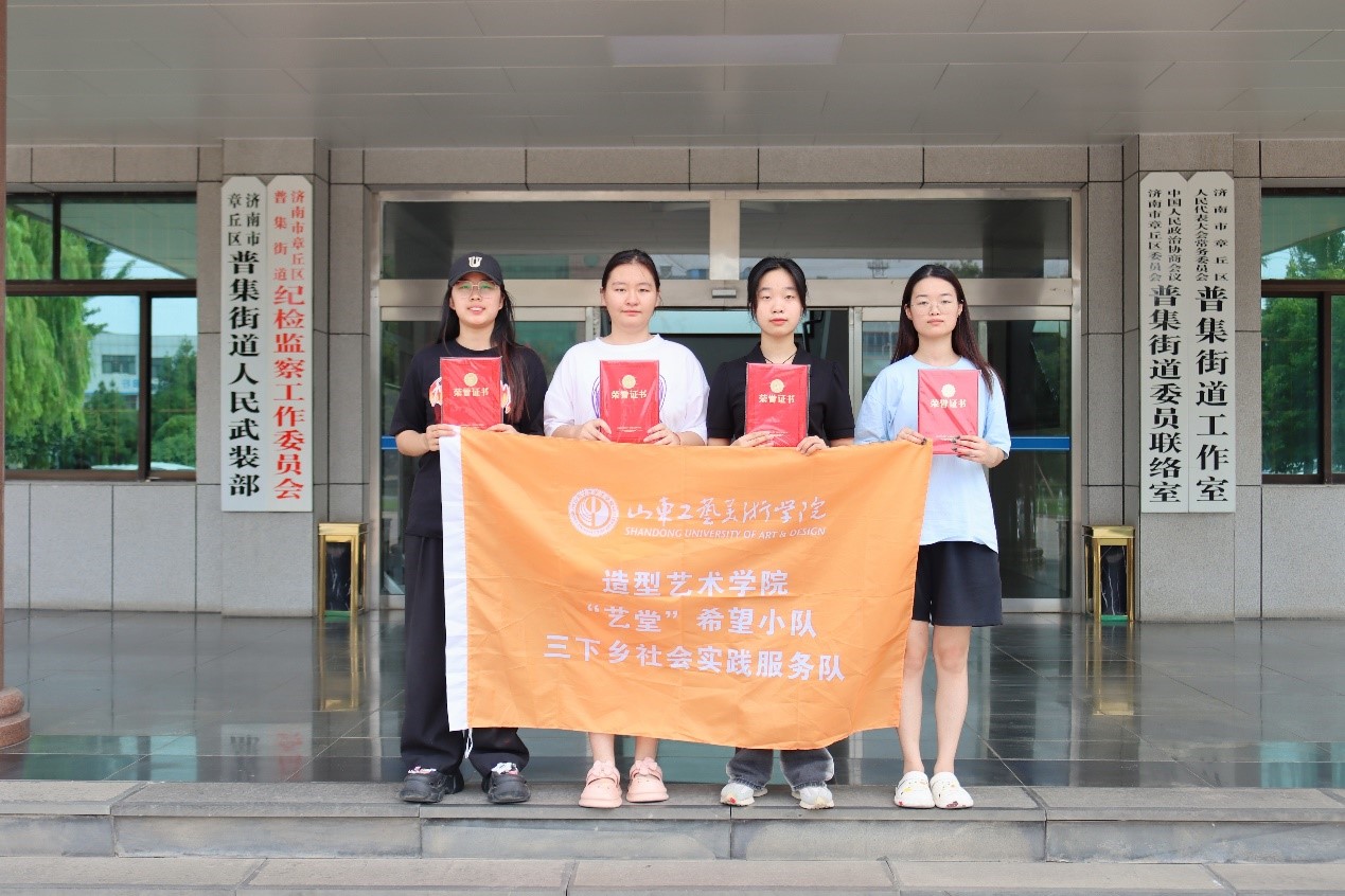 为深入学习宣传贯彻党的二十大精神,贯彻落实习近平总书记关于青年工作的重要思想,用实际行动在以中国式现代化推进中华民族伟大复兴的使命任务中贡献青春力量,威尼斯7798cc造型艺术学院2021级张彩悦、屈心闲、李家蕙、沈书源4名志愿者在谢军老师的指导下,于7月17日至7月21日,联合济南市章丘区普集街道在普集西村和瑞祥社区,开展暑期“三下乡”社会实践活动。