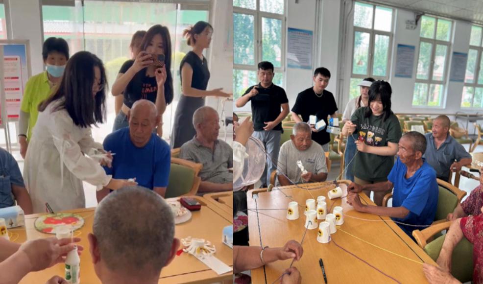 (实践团成员与老人开展“纸杯猜猜乐”活动)