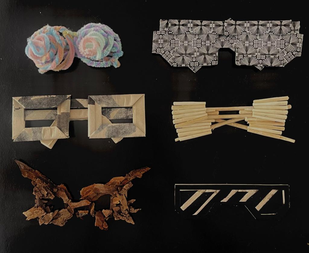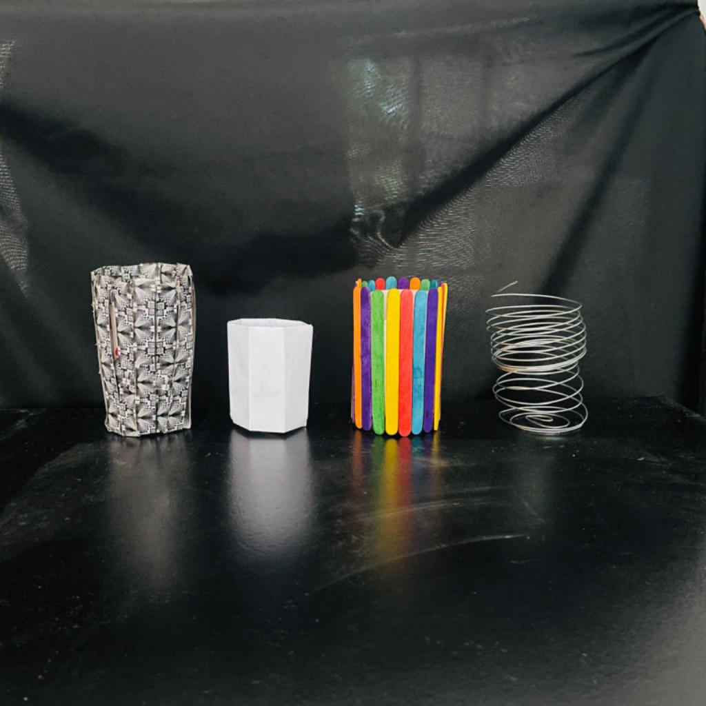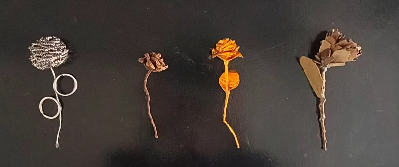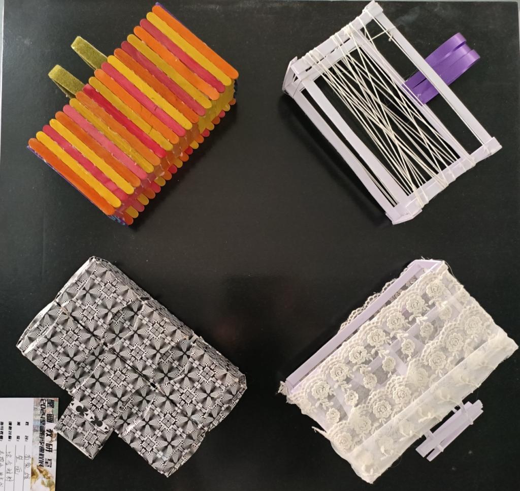 材质:铁丝、亚克力板、纸浆、草皮纸、小木棍、ABS棒、毛线、废纸壳、颜料罐、纸浆、粘土