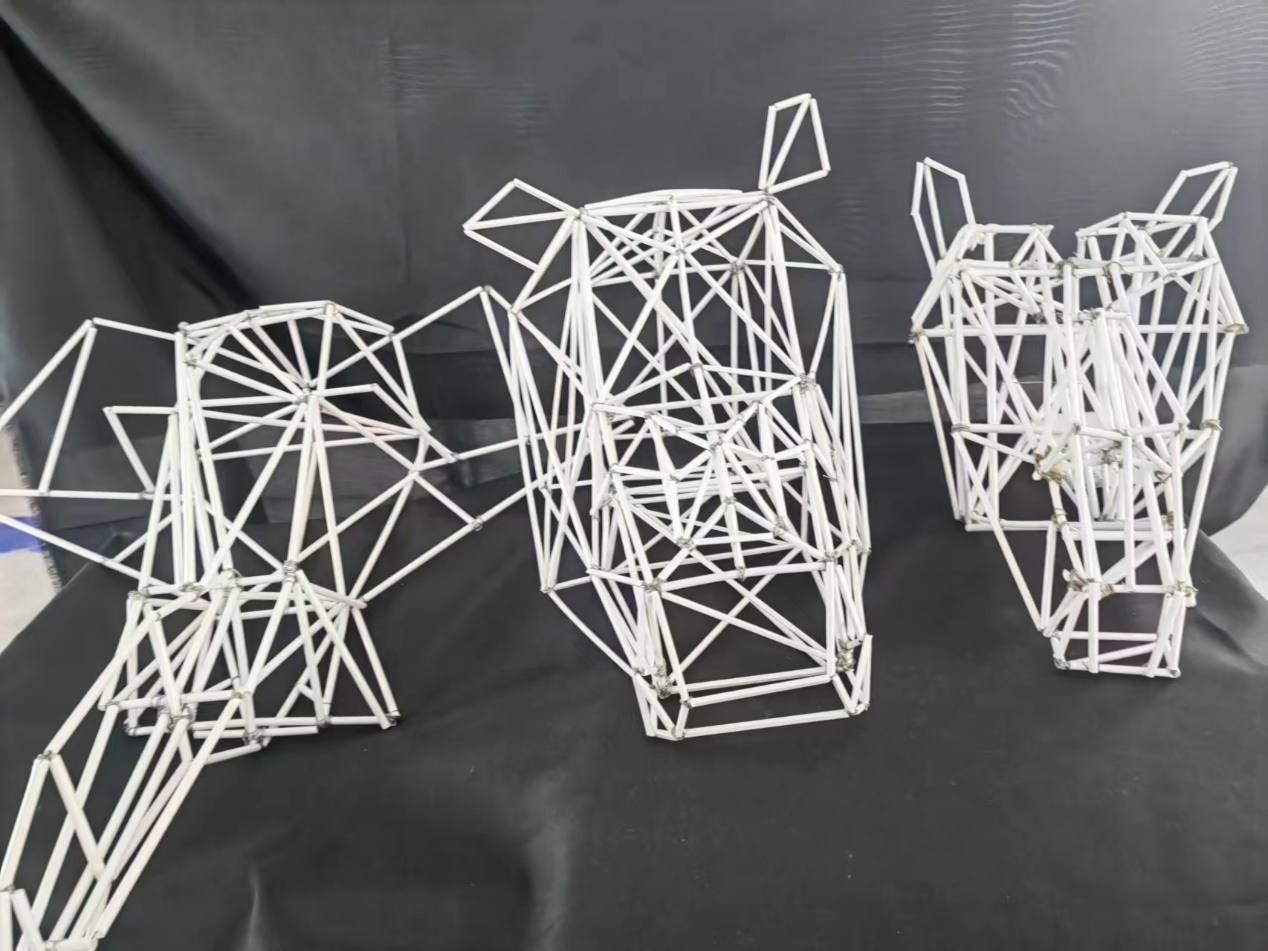 作品由三个动物脑袋组成,分别是羚羊、大象和犀牛,象征着陆地上独特的野生动物。整个作品全部使用回收的PVC管制作,充分体现了低碳环保的理念。动物脑袋的作品设计采用简约风格,减少了装饰和额外材料的使用,降低了制作过程中的能源消耗和碳排放。这个全部使用回收塑料PVC管制作的动物脑袋作品,以羚羊、大象和犀牛为创意原型,结合低碳环保的理念,提醒人们关注环境保护,倡导绿色生活。同时,该作品也展示了通过创造性地使用回收材料,可以实现艺术与环保的有机结合。