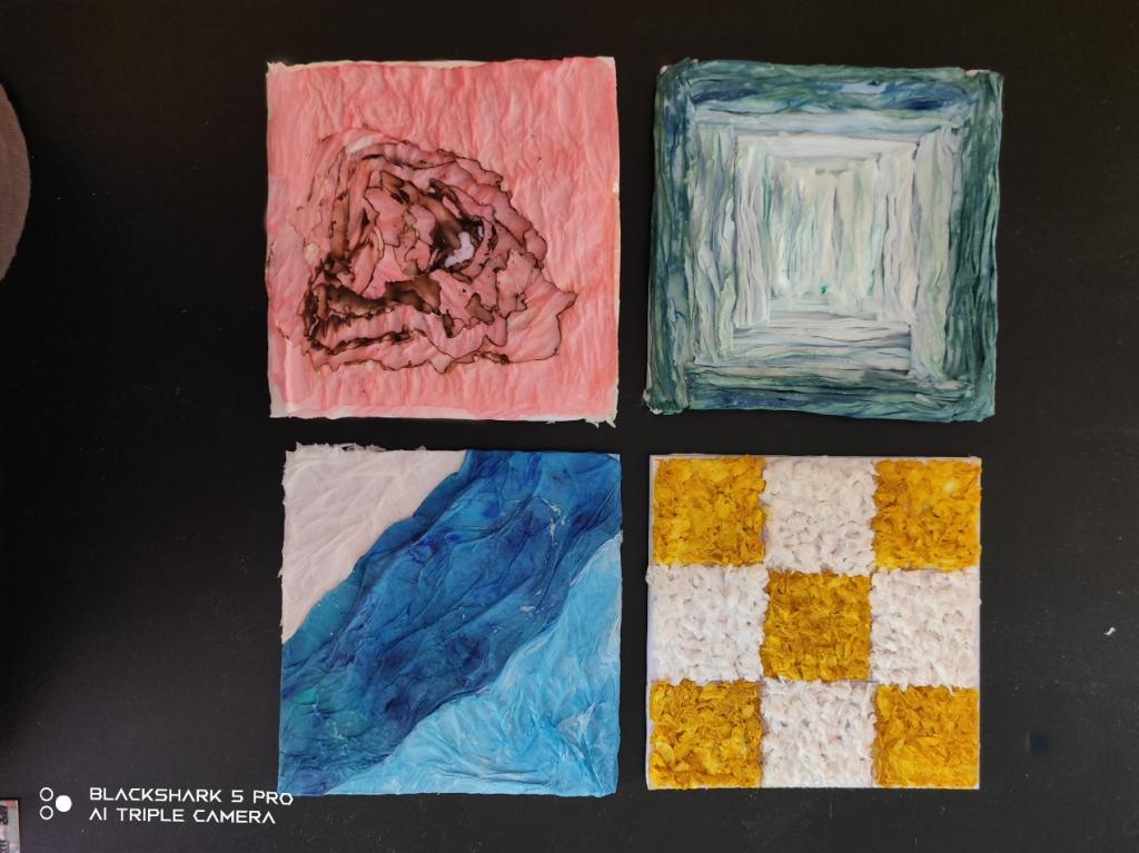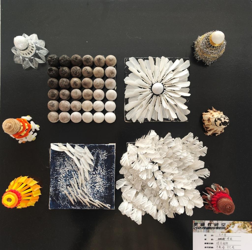 综合材料是壁画专业课程中重要的一门主干课,主要通过对不同材料的运用与探索,结合壁画、公共艺术等艺术形式与载体加以创造,是对艺术的一种再升华,同时不同材料的使用也为璧画创作注入了新的活力与可能。通过对不同材料的运用,甚至包括废旧材料、如,废旧塑料瓶、脱落的树皮、废旧电路板、废旧纸壳等物品,通过排列、重复、叠加、阵列等艺术手法加以处理创造,使它以全新的艺术品形式和面貌展现给观者。每一件作品都是对生态环境现状的反思,也是对环境保护的美好展望。让我们看到了艺术在多元碰撞下所绽放的绚丽火花,也让我们感受到了年轻艺术家们在不断创新与突破中的成长与进步。