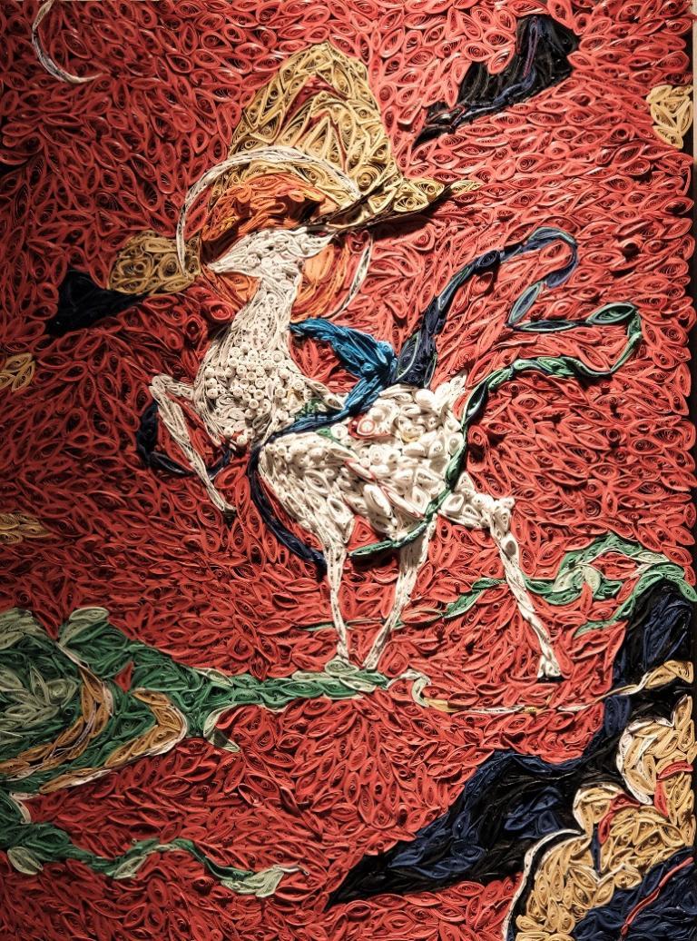 《遇见白鹿》敦煌九色鹿,这一源自敦煌壁画的传奇形象,本身就承载着深厚的文化底蕴和神秘的色彩。通过衍纸这种细腻而富有表现力的手工形式,九色鹿仿佛被赋予了新的生命。制作过程中,精心挑选的各种色彩的衍纸条,经过卷曲、弯曲、组合等一系列细致的操作,逐渐勾勒出九色鹿优美的轮廓、华丽的皮毛以及灵动的姿态。每一条衍纸线条都仿佛是画笔的笔触,细腻地描绘出九色鹿的神韵。