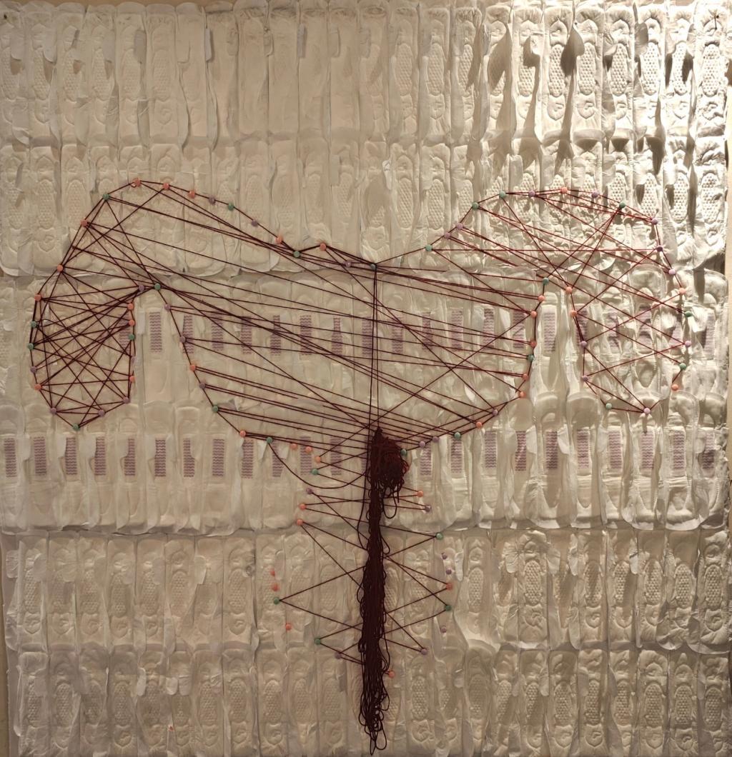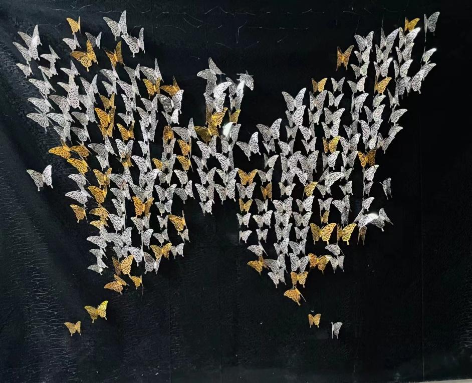 作品材质:彩绳、铁片、可塑料、筷子、黑色网纱、银蝴蝶、金蝴蝶