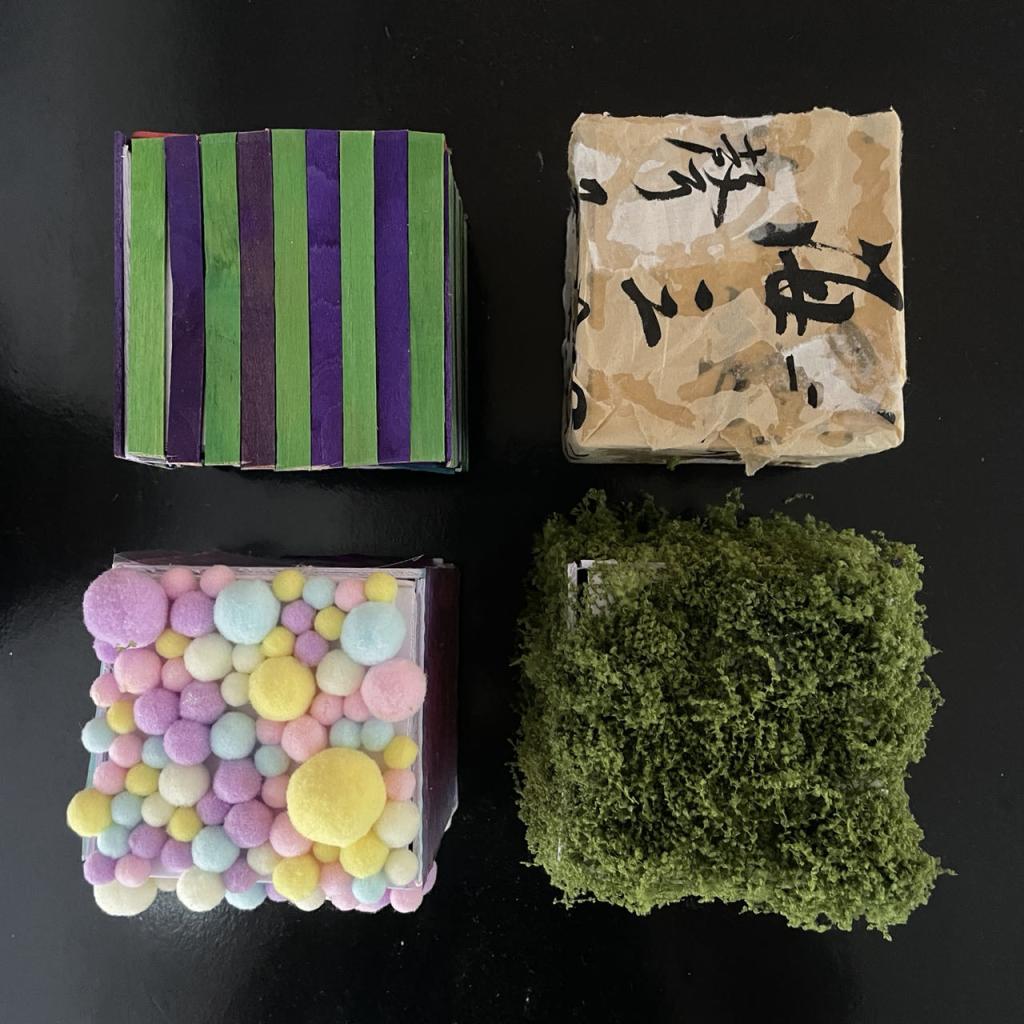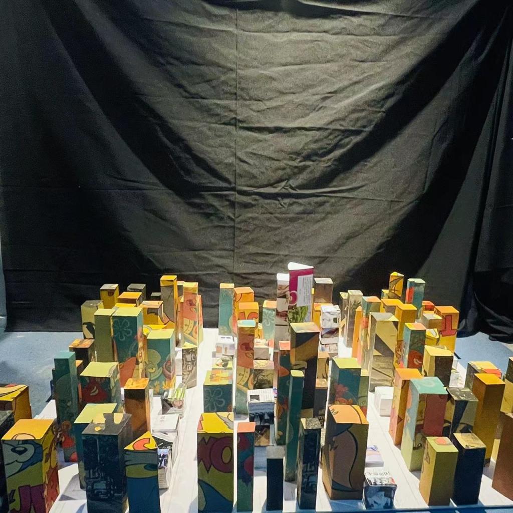 立体作品《方块》以游戏《Minecraft》中的草方块为启发,用生活中的废料装饰方块,启发人们注重废物利用。