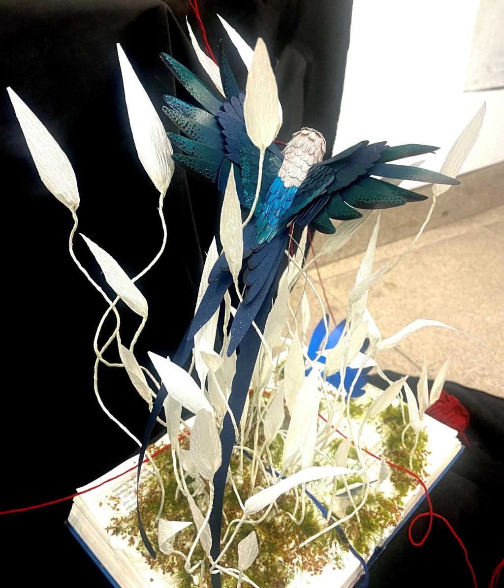 作品形式通过运用超轻粘土、铁丝、卡纸、植物组合,表现了鸟儿向往自由之意,周围的羽毛是托举的意思,也同样寓意了绿色的生态环境才能托举起鸟儿(生物)的生长与多样性。