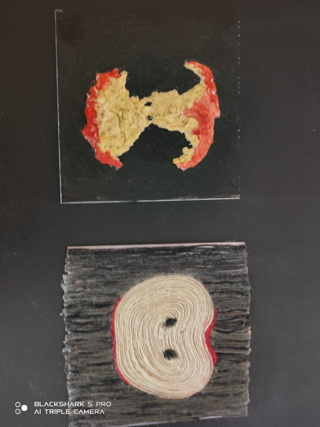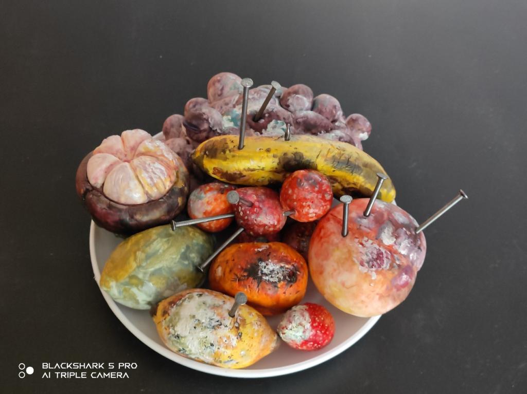 本次综合材料课程,我采用多为纸张,棉麻线以及超轻黏土等材料,相对低碳轻便,不易造成环境威胁。同时,腐烂的水果的作品立意,让人看到腐烂之物状态的同时也希望能引发同学们对事物爱惜的思考,能更加重视去爱护周围的环境及事物,力所能及的去保护环境爱护环境。