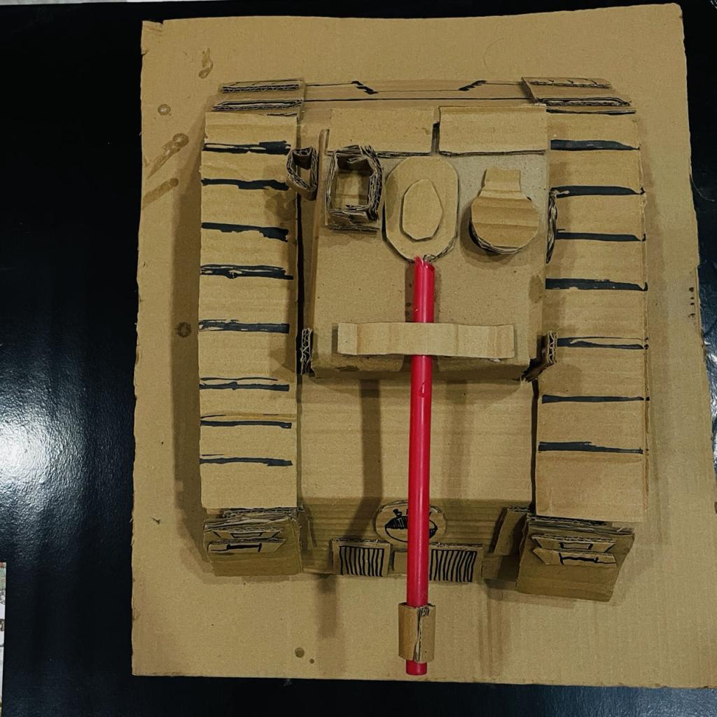 坦克是一种装备有重型火炮和装甲的装甲战斗车辆,通常用于地面战斗。它是20世纪初期发展起来的一种重要军事装备,对于现代战争的发展产生了深远的影响。坦克的出现使得战场上的战术和战略发生了巨大的变革,成为了现代陆地作战的主要力量。该作品用烟盒和纸板组成坦克,该作品凸显出废物利用,低碳环保的理念。