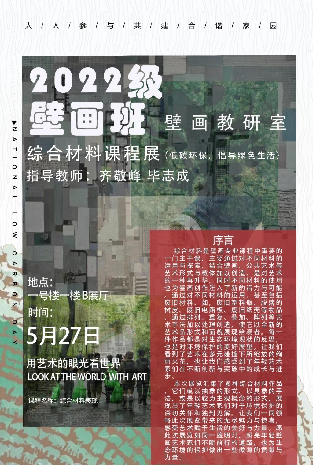 本次展览汇集了多种综合材料作品,它们或以抽象的形式、以具象的手法,或是以较为主观概念的形式,展现出了年轻艺术家们对于环境保护的深切关怀和独到见解。让我们一同领略此次展览带来的无尽魅力与惊喜,感受艺术赋予生活的美好与力量。愿此次展览如同一盏明灯,照亮年轻壁画艺术家们不断前行的道路,也为生态环境的保护做出一些微薄的贡献与力量。