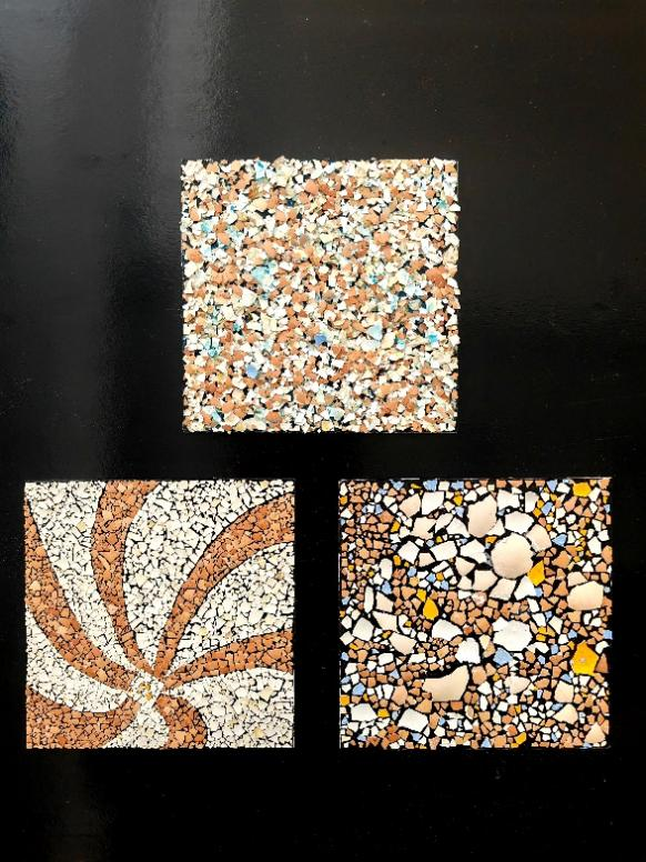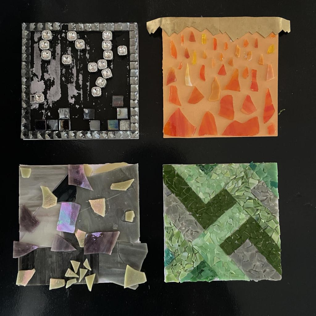 玻璃拼贴画作品《自然韵律》则用四种颜色体现了自然中的植物、阳光、大地、人类科技等物象,象征自然的生生不息。
