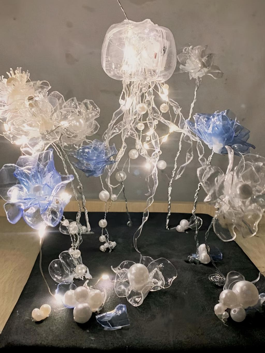 废弃的塑料不仅污染环境,还会威胁人类身体的健康。该作品使用废物利用,变废为宝的理念,水母形态是使用塑料瓶剪成的,使用废弃塑料瓶做成的梦幻水母,表达对海洋生态环境的保护;永不凋谢的塑料花,更是带给大家对于环保与艺术的思考。通过加热重塑让它们回归自然形状,只要一点小加工,废弃也能变成可持续的浪漫,告诫人们应该爱护海洋环境与自然和谐相处,让梦幻水母成为现实在深海里自由快乐的生活。
