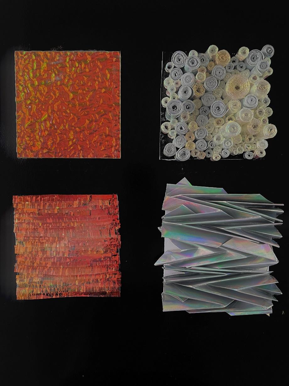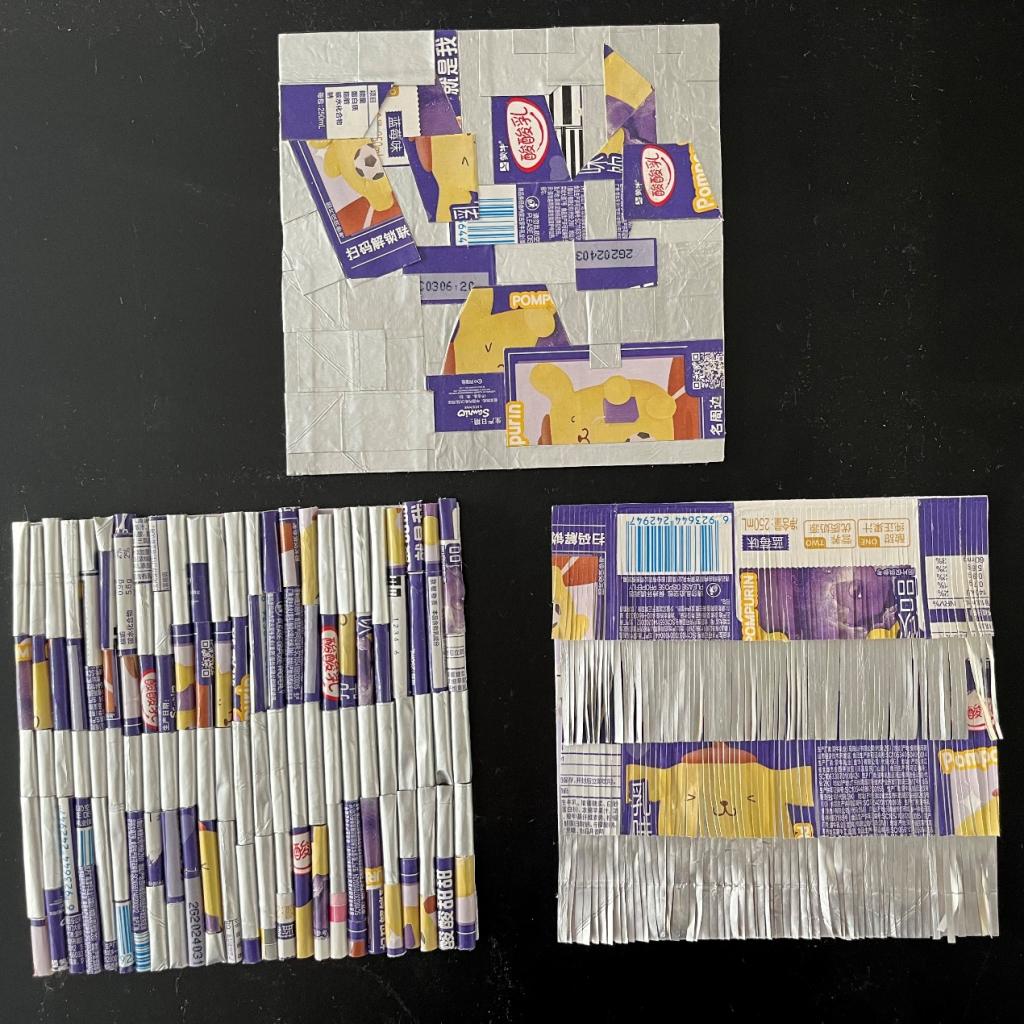 材质:吸管、金锡纸、牛奶盒、镭射纸、宣纸、包装盒、塑料袋、光盘、硬卡纸